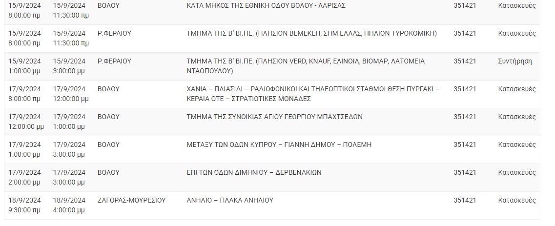 Ειδοποιούνται οι κάτοικοι των παρακάτω περιοχών ότι, για να εκτελεσθούν οι απαραίτητες τεχνικές εργασίες της ΔΕΔΔΗΕ, θα γίνει διακοπή του ηλεκτρικού ρεύματος: