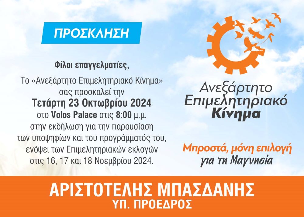 Ο επικεφαλής της παράταξης και πρόεδρος του Επιμελητηρίου Μαγνησίας Αριστοτέλης Μπασδάνης θα παρουσιάσει τις δράσεις στη διάρκεια της δεκατριάχρονης θητείας του στη διοίκηση του επιμελητηριακού φορέα, το πρόγραμμα και τους στόχους της παράταξης για την επόμενη ημέρα, αλλά και τους υποψήφιους που απαρτίζουν το νικηφόρο ψηφοδέλτιο.