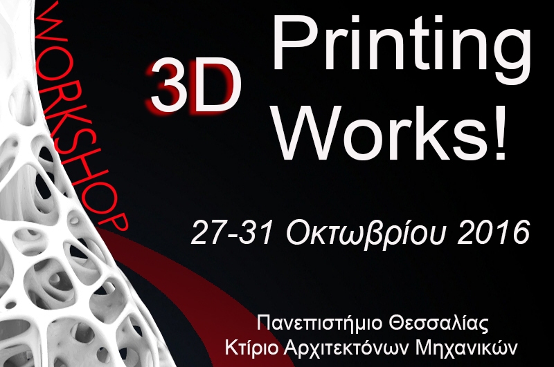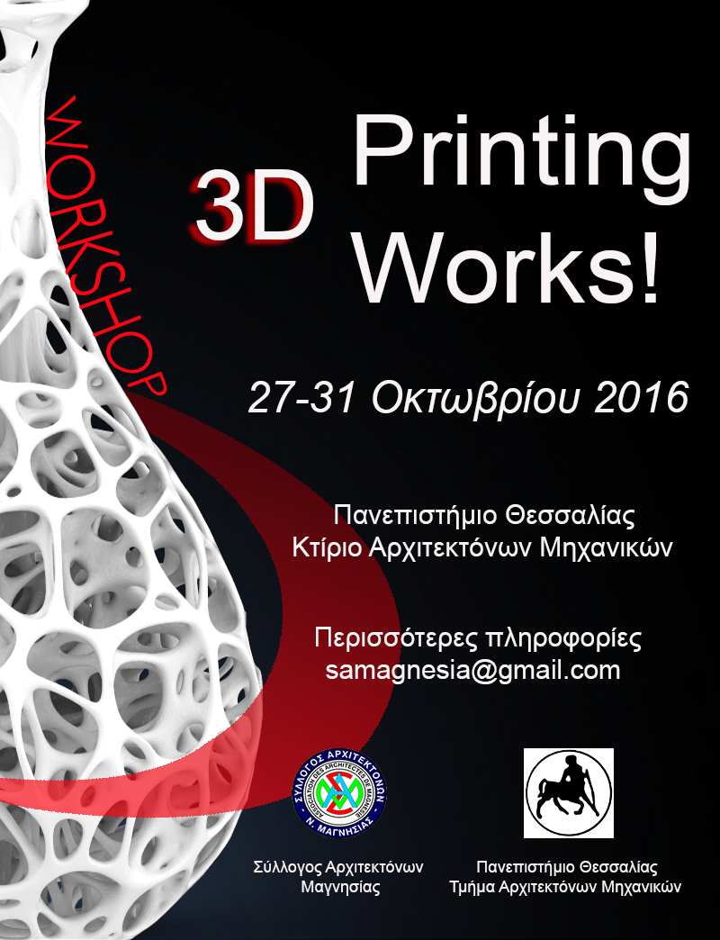 Στο πλαίσιο της εκπαιδευτικής συνεργασίας φορέων, ο Σύλλογος Αρχιτεκτόνων Μαγνησίας (ΣΑΜ) και το Πανεπιστήμιο Θεσσαλίας, προσκαλούν τον κάθε ενδιαφερόμενο να δηλώσει συμμετοχή στο πιλοτικό εργαστήριο τρισδιάστατης εκτύπωσης, 3D Printing Works, το οποίο θα πραγματοποιηθεί κατά το μήνα Οκτώβριο και θα φιλοξενηθεί στο χώρο του Τμήματος Αρχιτεκτόνων του Πανεπιστημίου Θεσσαλίας στην πόλη του Βόλου.
