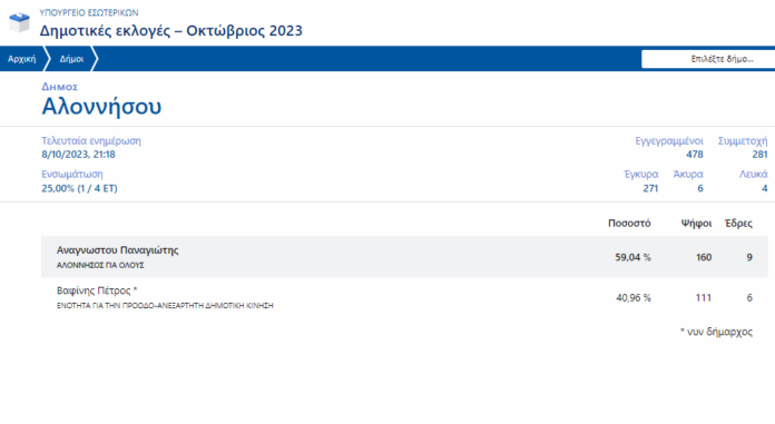 Ο Παναγιώτης Αναγνώστου προηγείται στη διαδικασία των δημοτικών εκλογών στην Αλόννησο, απέναντι στον νυν δήμαρχο Πέτρο Βαφίνη.