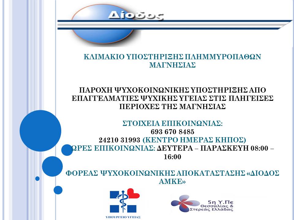 Η Κινητή Μονάδα Μαγνησίας για την Ψυχική Υγεία, δομή της Δίοδος ΑμΚΕ, έλαβε έγκριση σκοπιμότητας από το Υπουργείο Υγείας και προχώρησε ήδη στη σύσταση ενός επιπλέον κλιμακίου για τη στήριξη των πληγέντων από τις καταστροφικές πλημμύρες. Λόγω των ιδιαίτερα αυξημένων αναγκών που έχουν προκύψει το τελευταίο χρονικό διάστημα στην περιοχή, ενισχύεται περαιτέρω το έργο της επιστημονικής ομάδας με δύο κοινωνικούς λειτουργούς και έναν ψυχολόγο.