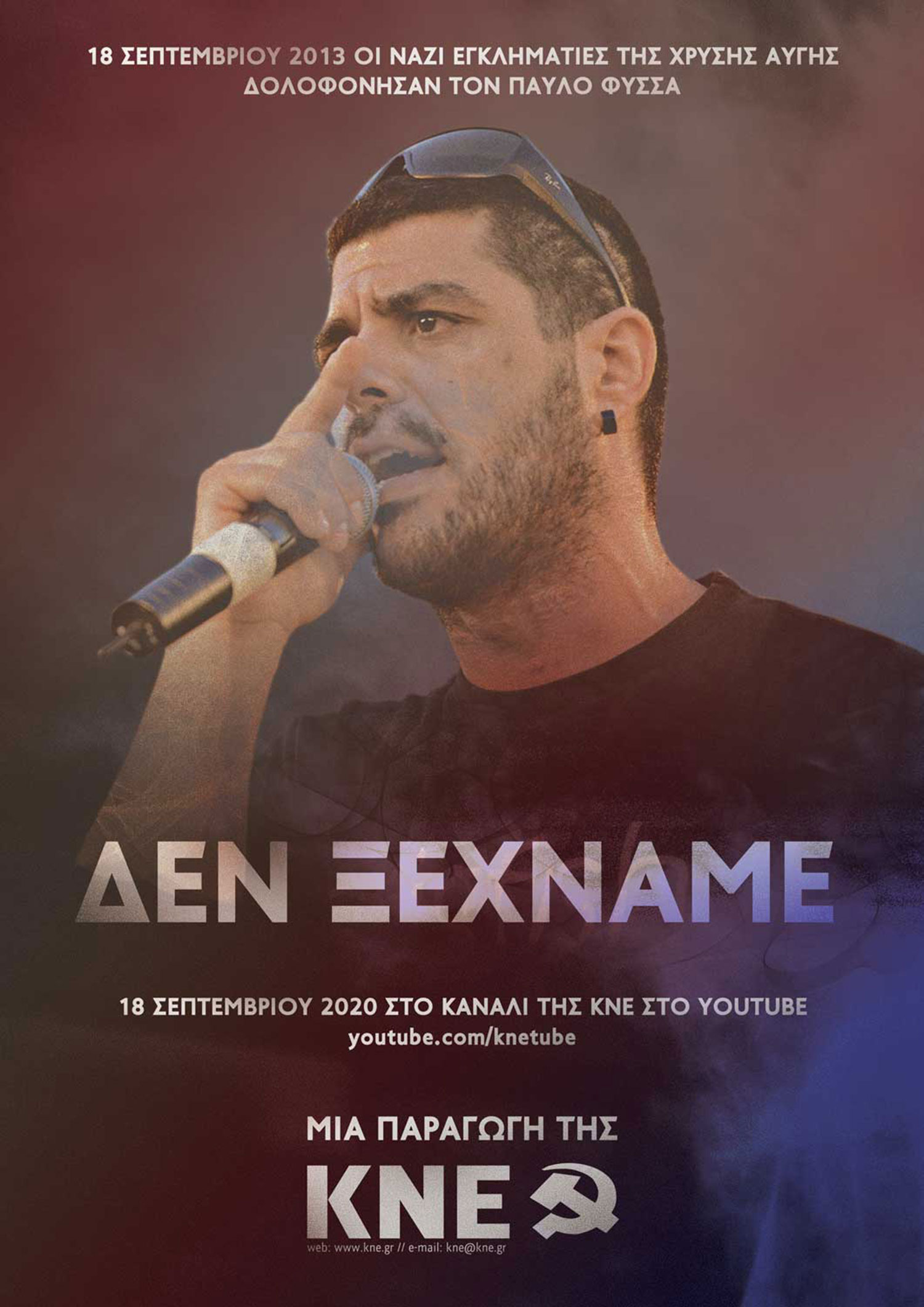 Με αφορμή τη συμπλήρωση 7 χρόνων από τη δολοφονία του αντιφασίστα μουσικού, Παύλου Φύσσα, καθώς και την ολοκλήρωση της δίκης της ναζιστικής – εγκληματικής οργάνωσης Χρυσή Αυγή, με την έκδοση απόφασης στις 7 Οκτώβρη, η ΚΝΕ, όπως ενημερώνει σε ανακοίνωσή του το ΚΚΕ Μαγνησίας, ετοίμασε ένα ντοκιμαντέρ με τίτλο «Δεν ξεχνάμε», που θα δημοσιοποιηθεί ανήμερα της επετείου της δολοφονίας του Παύλου Φύσσα, σήμερα Παρασκευή 18 Σεπτέμβρη, στο κανάλι της ΚΝΕ στο youtube.