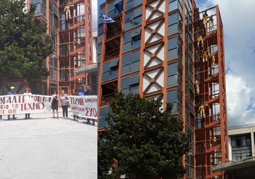 Με το σύνθημα “βγάλε τη θηλιά από τις Τέχνες” οι εκπαιδευτικοί καλλιτεχνικών μαθημάτων της Μαγνησίας βρέθηκαν στη κτήριο της Δευτεροβάθμιας Εκπαίδευσης προκειμένου να διαμαρτυρηθούν για ακόμη μία φορά για την μείωση έως και την κατάργηση των μαθημάτων που διδάσκουν από το δημόσιο σχολείο. Οι καλλιτέχνες εκπαιδευτικοί αυτή τη φορά προτίμησαν να διαμαρτυρηθούν μέσα από την Τέχνη, καθώς ανδρείκελα κρέμονταν από θηλιές και συμβόλιζαν την “επίθεση” που δέχεται ο πολιτισμός από το Υπουργείο Παιδείας.