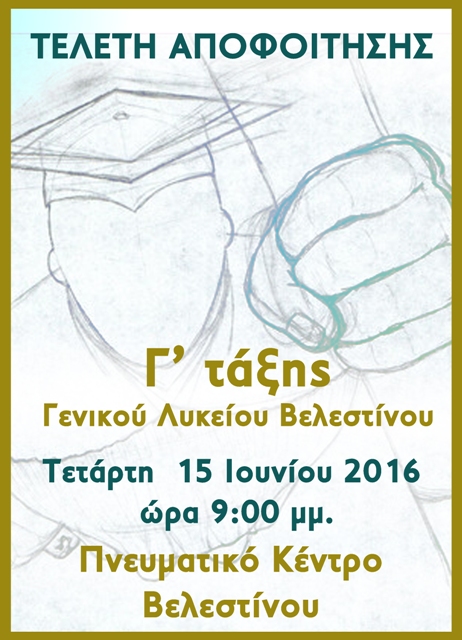 Καθιερώνεται φέτος, για πρώτη φορά, ένας νέος θεσμός που θα γίνεται κάθε χρόνο, η Τελετή Αποφοίτησης της Γ’ Λυκείου και αφορά την πλειοψηφία των μαθητών του δήμου . Όπως αναφέρουν οι διοργανωτές, «ξεκινώντας τη σχολική ζωή από διαφορετικά σχολεία προέλευσης του Δήμου, οι μαθητές καταλήγουν στην τελική ευθεία του Γενικού Λυκείου Βελεστίνου.