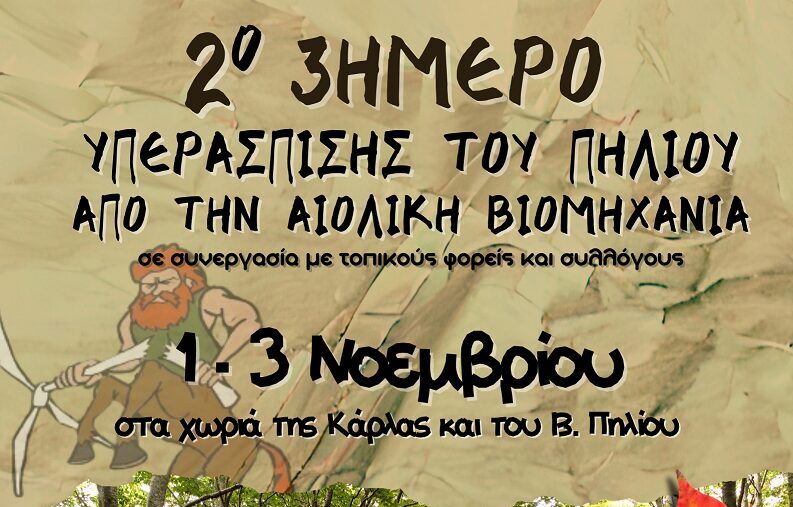 Εκδόθηκε από τη «Συνέλευση Υπεράσπισης του Πηλίου από την αιολική βιομηχανία» το πρόγραμμα του «2ου Τριημέρου Υπεράσπισης του Πηλίου από την Αιολική Βιομηχανία», το οποίο θα πραγματοποιηθεί στα δύο χωριά Κανάλια και Κερασιά (Δήμου Ρήγα Φεραίου Μαγνησίας) από την 1η έως τις 3 Νοεμβρίου και γίνεται, όπως επισημαίνουν οι διοργανωτές, ως μια υπενθύμιση και αντίδραση στο τερατούργημα που επιχειρείται να εγκατασταθεί ανάντη της λίμνης Κάρλας.