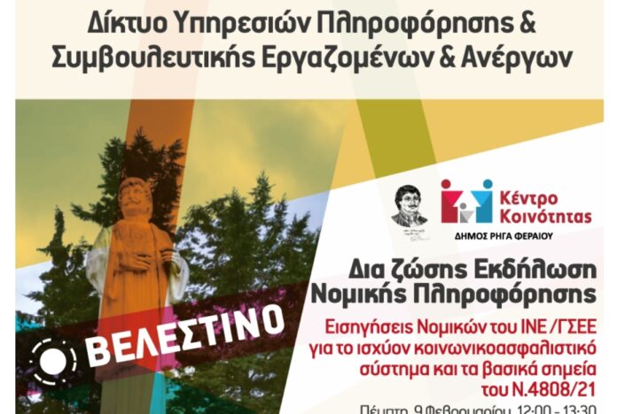 Λόγω καιρικών συνθηκών που θα δυσχεράνουν την πρόσβαση τόσο των νομικών όσο και των ενδιαφερόμενων πολιτών, το Κέντρο Κοινότητας του Δήμου Ρήγα Φεραίου ανακοινώνει την ακύρωση της ενημερωτικής εκδήλωσης για ισχύον κοινωνικοασφαλιστικό σύστημα, καθώς και για τα βασικά σημεία του νέου εργασιακού νόμου, που είχε προγραμματιστεί για σήμερα, Πέμπτη στο Βελεστίνο. Η εκδήλωση θα προγραμματιστεί με την πρώτη δυνατή διαθεσιμότητα των νομικών.
