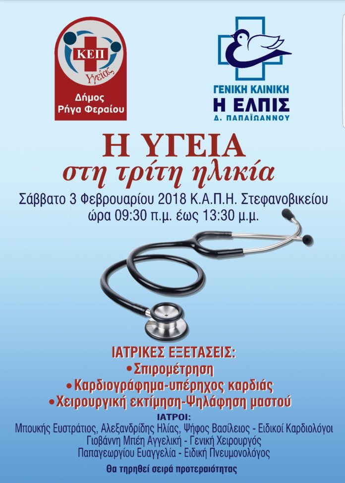 Όπως αναφέρεται σε σχετική ανακοίνωση, «συνεχίζοντας την εκστρατεία πρόληψης, ενημέρωσης και ευαισθητοποίησης των δημοτών σε θέματα υγείας, το ΚΕ.Π. Υγείας πραγματοποιεί σε συνεργασία με την γενική κλινική «Η Ελπίς», το Σάββατο 3 Φεβρουαρίου 2018 στο χώρο του ΚΑ.ΠΗ Στεφανοβικείου προληπτικό έλεγχο υγείας στους ηλικιωμένους της περιοχής από τις 09:30 έως και τις 13.30. Στόχος της δράσης είναι η στήριξη της υγείας των ηλικιωμένων συνδημοτών. Μην ξεχνάμε πως στα πλαίσια της οικονομικής κρίσης παρατηρείται το φαινόμενο αρκετά ζευγάρια να επιστρέφουν στην «πατρική» αγκαλιά των γονιών τους ώστε με την στήριξη τους να μπορέσουν να φροντίσουν τα υπόλοιπα μέλη της οικογένειας τους. Οι ηλικιωμένοι είναι αυτοί που συμπαραστέκονται σήμερα είτε με οικονομική στήριξη, είτε με τη φιλοξενία των παιδιών τους και την κάλυψη των αναγκών των εγγονιών τους αλλά ακόμη και με την ψυχική τους ανάταση, για να μπορέσουν να αντιμετωπίσουν τις δυσκολίες της σύγχρονης εποχής. Αξίζει η επιπλέον φροντίδα από μας για τα όσα έχουν προσφέρει.