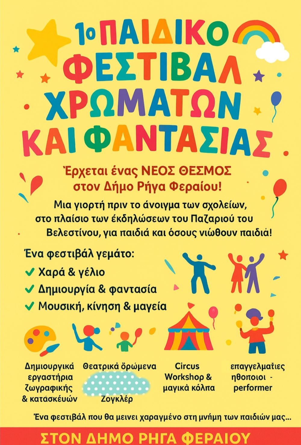 Το 1ο Παιδικό Φεστιβάλ Χρωμάτων και Φαντασίας θα πραγματοποιηθεί στις 8 και 9 Σεπτεμβρίου στο Βελεστίνο λίγο πριν το άνοιγμα των σχολείων και στο πλαίσιο διεξαγωγής του παζαριού του Βελεστίνου.
