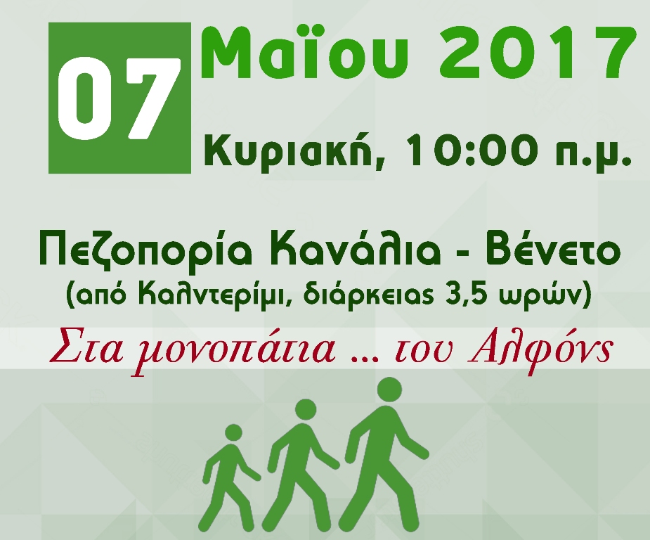 Ραντεβού την Κυριακή 07 Μαΐου 2017. Έναρξη διαδρομής από το γήπεδο Καναλίων και επιστροφή με λεωφορείο από το Βένετο.