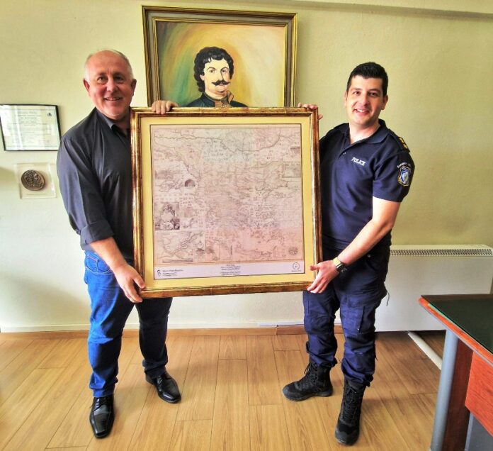 Στο πλαίσιο της επίσκεψης, ο Δήμαρχος κ. Δημήτρης Νασίκας προσέφερε στον Διοικητή κ. Βαρβάρη ένα πιστό αντίγραφο της Χάρτας του Εθνομάρτυρα Ρήγα Βελεστινλή.