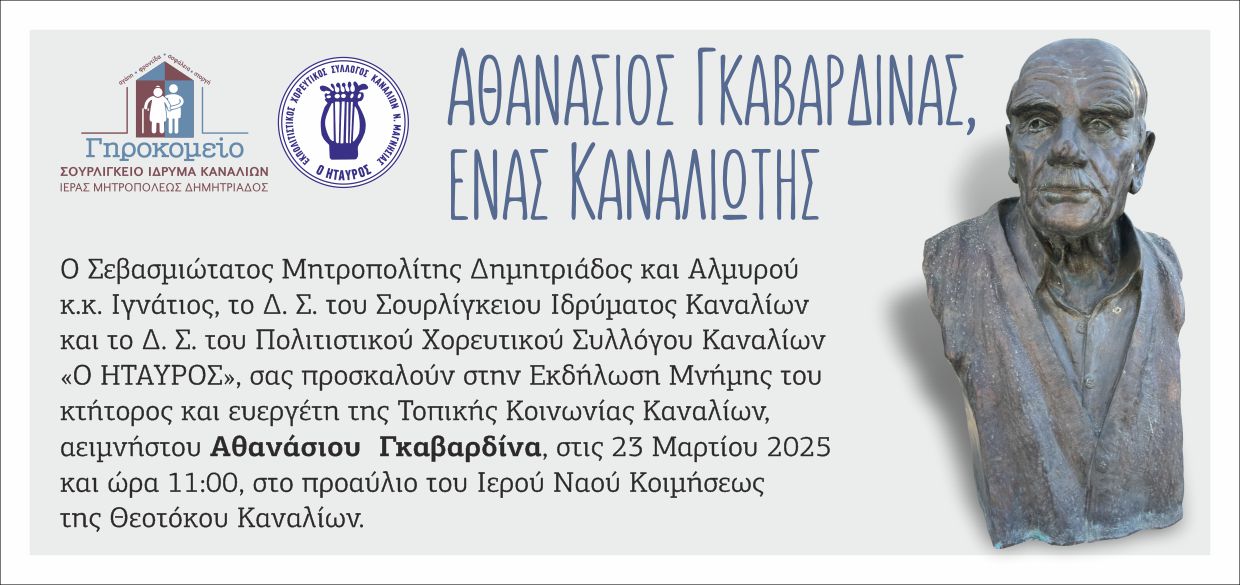 Με τη συμπλήρωση 7 ετών από την εκδημία του μακαριστού Αθανασίου Γκαβαρδίνα, τοπικού ευεργέτη και κτήτορος του Σουλίγκειου Ιδρύματος, θα πραγματοποιηθεί την Κυριακή 23 Μαρτίου και ώρα 11:00, στο προαύλιου του Ιερού Ναού Κοιμήσεως τη Θεοτόκου Καναλίων εκδήλωση μνήμης από το Σουρλίγκειο Ίδρυμα Καναλίων και τον Εκπολιτιστικό Χορευτικό Σύλλογο Καναλίων «Ο ΗΤΑΥΡΟΣ».