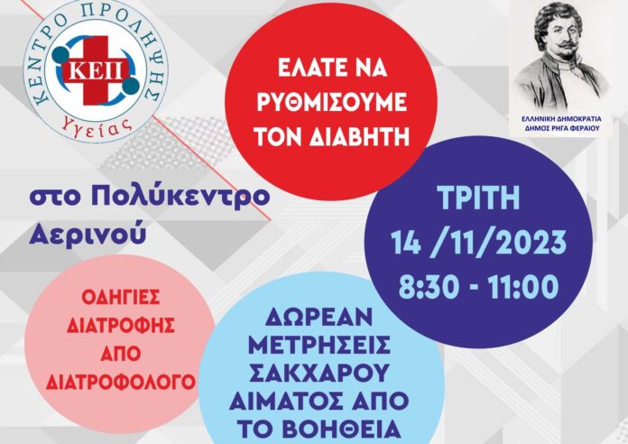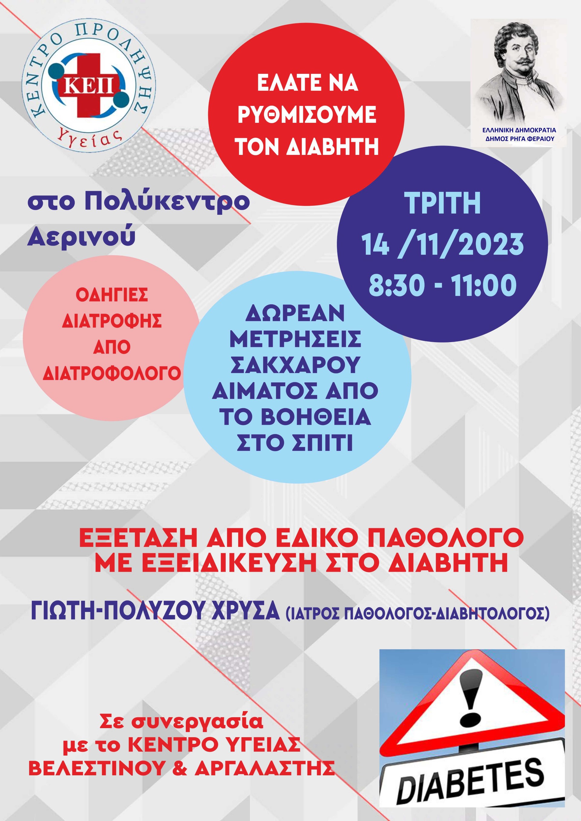Το ΚΕΠ ΥΓΕΙΑΣ του Δήμου Ρήγα Φεραίου διοργανώνει ενημερωτική δράση στο Πολυκέντρο Αερινού για την ευαισθητοποίηση στο πρόβλημα του διαβήτη. Σκοπός της είναι να ενημερώσει το κοινό για τα αίτια, τα συμπτώματα, τις επιπλοκές και τη θεραπεία της πάθησης αυτής. Η παγκόσμια Ημέρα για το διαβήτη χρησιμεύει ως μια σημαντική υπενθύμιση ότι η συχνότητα εμφάνισης και ο επιπολασμός του διαβήτη αυξάνονται παγκοσμίως και αυτό θα συνεχιστεί εκτός αν ληφθεί άμεσα δράση.