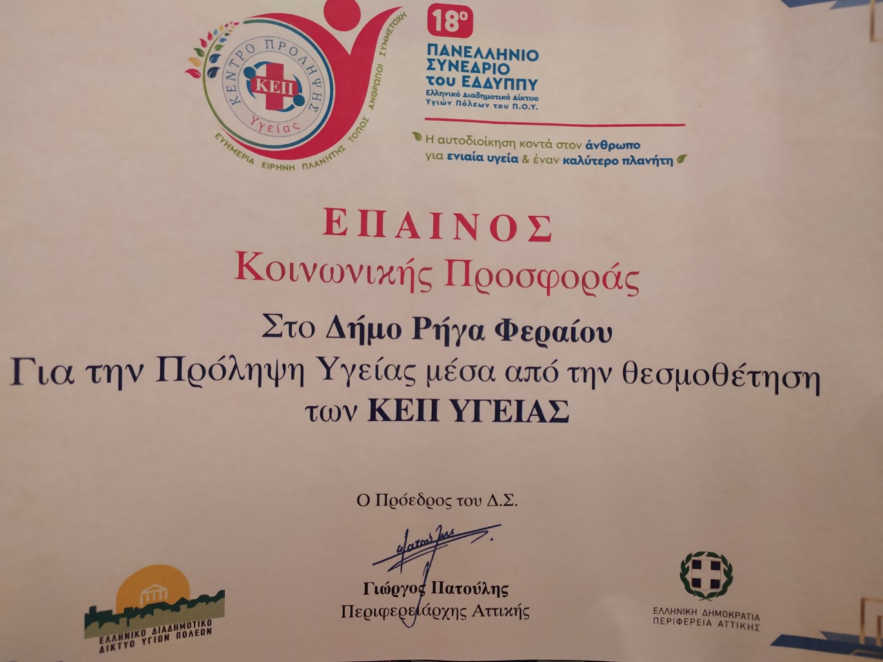 Στο 18ο Πανελλήνιο Συνέδριο του Ελληνικού Διαδημοτικού Δικτύου Υγιών Πόλεων (ΕΔΔΥΠΠΥ) του Παγκόσμιου Οργανισμού Υγείας (Π.Ο.Υ), που διεξήχθη το τριήμερο 6-8 Οκτωβρίου συμμετείχε ο Δήμος Ρήγα Φεραίου.