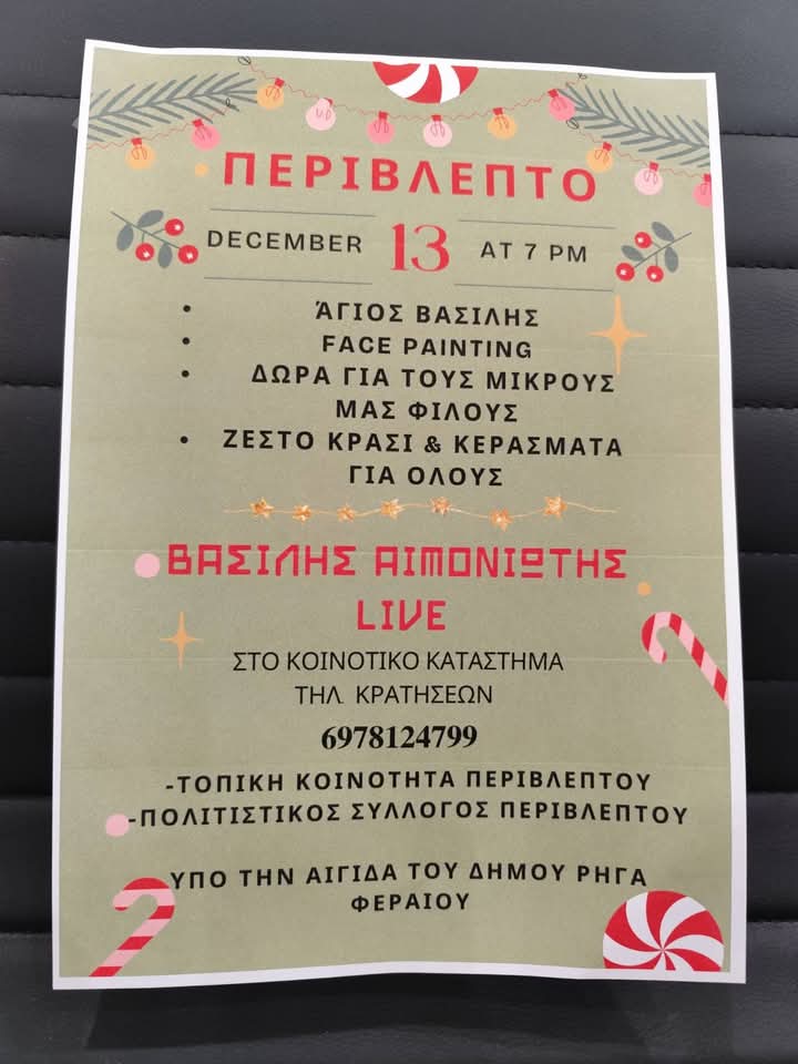 Η Τοπική Κοινότητα Περιβλέπτου και ο Πολιτιστικός Σύλλογος υπό την αιγίδα του Δήμου Ρήγα Φεραίου έχουν ετοιμάσει μία μεγάλη γιορτή στην οποία θα δώσει το παρών και ο Άγιος Βασίλης, μοιράζοντας δώρα σε όλα τα παιδιά. Παράλληλα, θα υπάρχουν δράσεις, παιχνίδια, face painting αλλά και ζεστό κρασί και κεράσματα για όλους.
