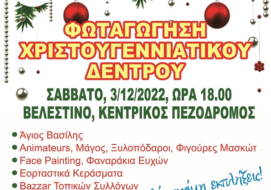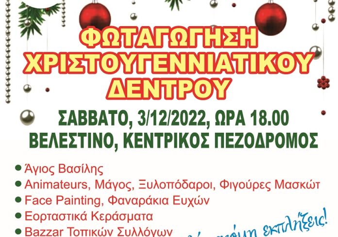 Το Σάββατο 3 Δεκεμβρίου και ώρα 18.00 στον Κεντρικό Πεζόδρομο του Βελεστίνου θα πραγματοποιηθεί η φωταγώγηση του Χριστουγεννιάτικου Δέντρου σε μια μαγευτική βραδιά που θα σημάνει την έναρξη των Χριστουγεννιάτικων Εκδηλώσεων του Δήμου Ρήγα Φεραίου.