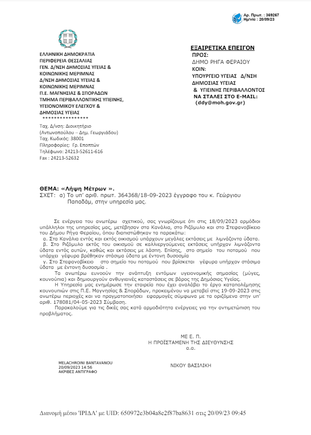 Με εξαιρετικά επείγον έγγραφο ( Αρ. πρωτ. 369267 20/09/2023) η Διεύθυνση Υγείας και Κοινωνικής Μέριμνας ΠΕ Μαγνησίας και Σποράδων προς τον δήμο Ρήγα Φεραίου ζητά τη λήψη μέτρων από τον δήμο Ρήγα Φεραίου για την αντιμετώπιση του προβλήματος με ενέργειες που ανήκουν στην αρμοδιότητα του δήμου.