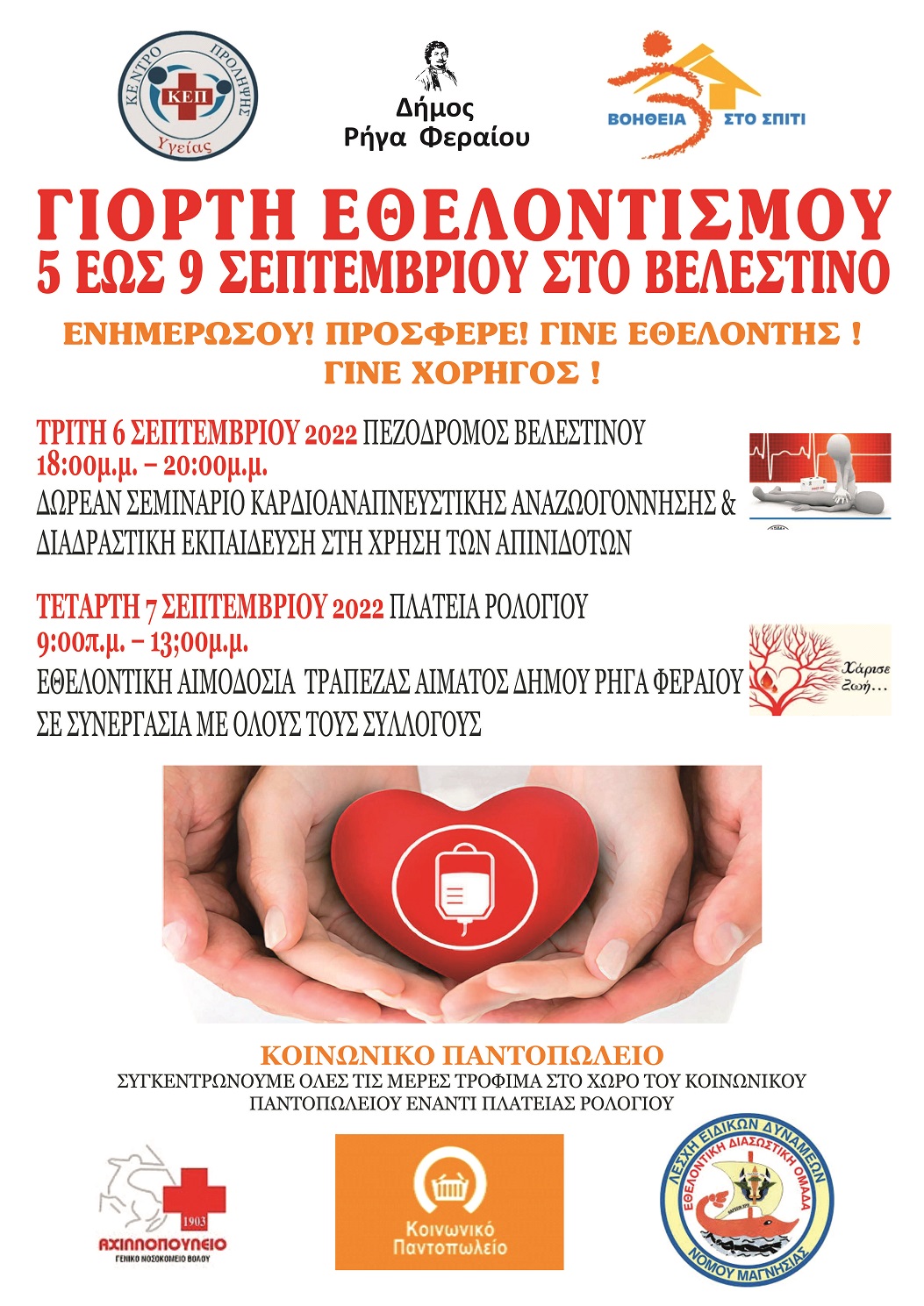 To KΕΠ Υγείας του Δήμου Ρήγα Φεραίου διοργανώνει γιορτή εθελοντισμού στις 5-9 Σεπτεμβρίου 2022 συμπεριλαμβάνοντας τις παρακάτω δράσεις :