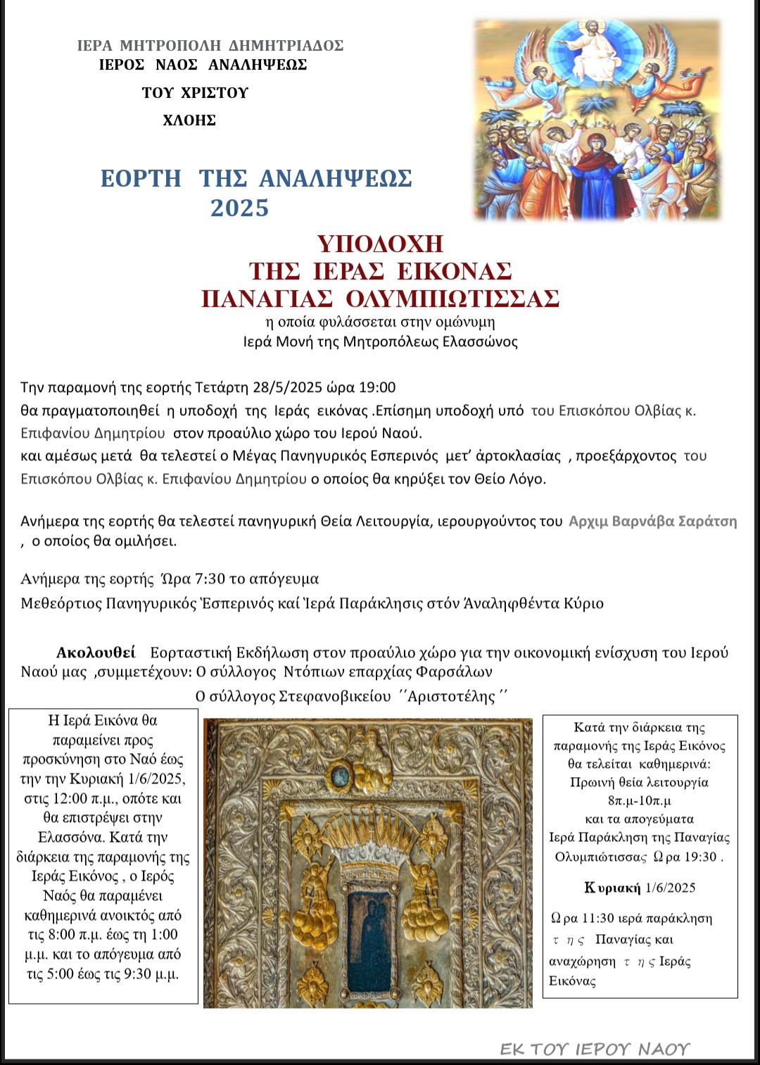 Η υποδοχή της Παναγίας Ολυμπιώτισσας θα γίνει την ερχόμενη Τετάρτη 28 Μαΐου στις 7 το απόγευμα, στο Ναό Αναλήψεως στη Χλόη , σύμφωνα με το παρακάτω πρόγραμμα
