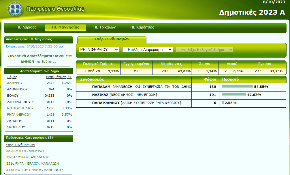 Από τα Κανάλια και το εκεί εκλογικό κέντρο έρχονται τα πρώτα αποτελέσματα από τον Δήμο Ρήγα Φεραίου, με τον Γιώργο Παπαδάμ να προηγείται απέναντι στον Δημήτρη Νασίκα.