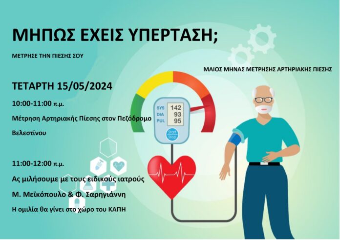 Με αφορμή την παγκόσμια ημέρα υπέρτασης, το ΚΕΠ Υγείας και το Βοήθεια στο σπίτι του Δήμου Ρήγα Φεραίου διοργανώνουν ενημερωτική δράση με τίτλο «Μέτρησε την πίεσή σου» με σκοπό να ενημερώσει τον γενικό πληθυσμό για τη σημασία της έγκαιρης διάγνωσης της υπέρτασης και της αποτελεσματικής αντιμετώπισής της.