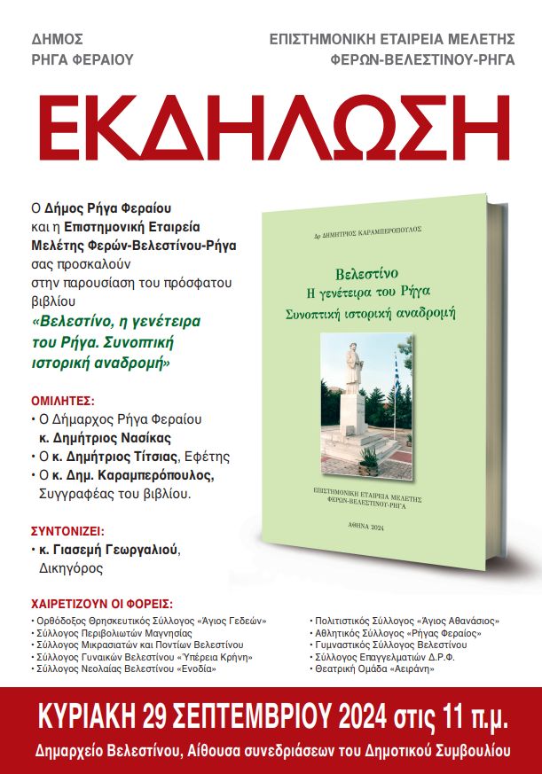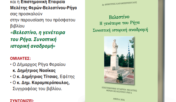 Ο Δήμος Ρήγα Φεραίου και η Επιστημονική Εταιρεία Μελέτης Φερών- Βελεστίνου- Ρήγα διοργανώνουν την Κυριακή 29 Σεπτεμβρίου στις 11 το πρωί στην αίθουσα συνεδριάσεων του Δημοτικού Συμβουλίου, στο Δημαρχείο Ρήγα Φεραίου στο Βελεστίνο, την παρουσίαση του βιβλίου του Δρ. Δημήτριου Καραμπερόπουλου με τίτλο «Βελεστίνο, η γενέτειρα του Ρήγα. Συνοπτική ιστορική αναδρομή».
