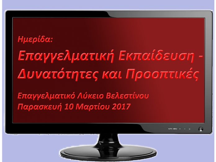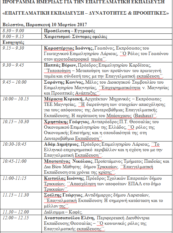 Η Περιφερειακή Διεύθυνση Εκπαίδευσης Θεσσαλίας διοργανώνει προσυνεδριακή ημερίδα με θέμα «ΕΠΑΓΓΕΛΜΑΤΙΚΗ ΕΚΠΑΙΔΕΥΣΗ – ΔΥΝΑΤΟΤΗΤΕΣ & ΠΡΟΟΠΤΙΚΕΣ», την Παρασκευή, 10 Μαρτίου 2017, στο Βελεστίνο, στην αίθουσα εκδηλώσεων του ΕΠΑ.Λ. Βελεστίνου.