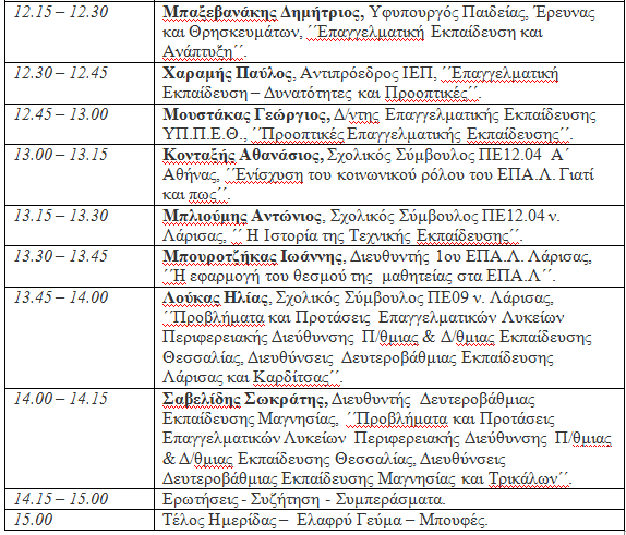 Η ημερίδα θα περιλαμβάνει ομιλίες, εισηγήσεις και συζήτηση με τη συμμετοχή του Υφυπουργού Παιδείας, κ. Μπαξεβανάκη Δημητρίου, του Αντιπροέδρου του ΙΕΠ, κ. Χαραμή Παύλου, του Διευθυντή Επαγγελματικής Εκπαίδευσης του ΥΠ.Π.Ε.Θ, κ. Μουστάκα Γεωργίου και των Διευθυντών όλων των ΕΠΑ.Λ.