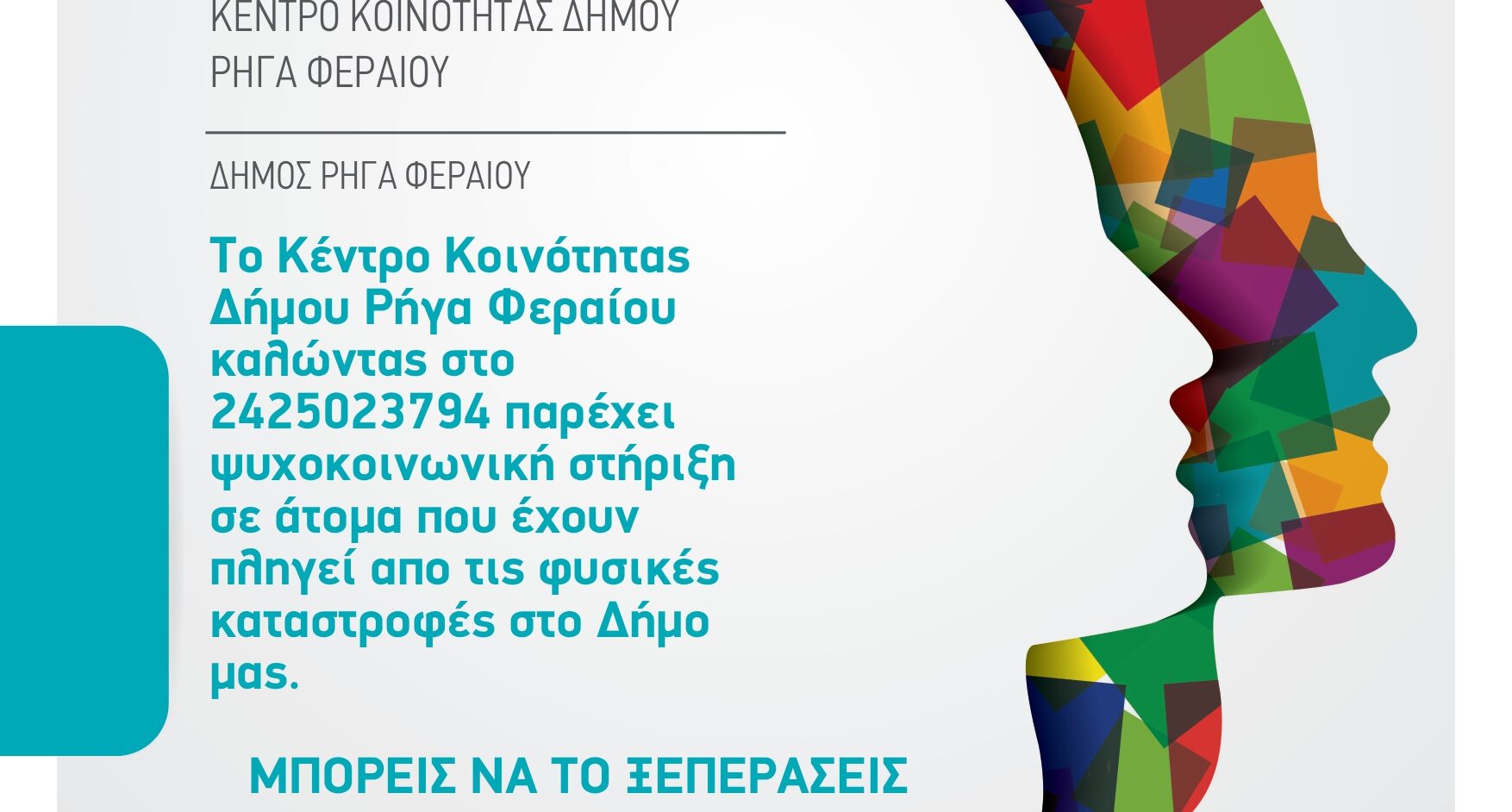 Το Κέντρο Κοινότητας του Δήμου Ρήγα Φεραίου ανακοινώνει δράση ψυχολογικής στήριξης των πληγέντων. Οι ενδιαφερόμενοι μπορούν να καλούν στο 2425023794 και το Κέντρο θα τους παρέχει ψυχοκοινωνική στήριξη.