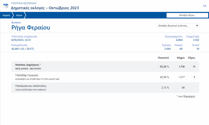 Με ποσοστό 55,29% και 1710 ψήφους ο Δημήτρης Νασίκας συνεχίζει να έχει το προβάδισμα σε 12 από τα 28 τμήματα στα οποία έχει ολοκληρωθεί η καταμέτρηση στον δήμο Ρήγα Φεραίου.