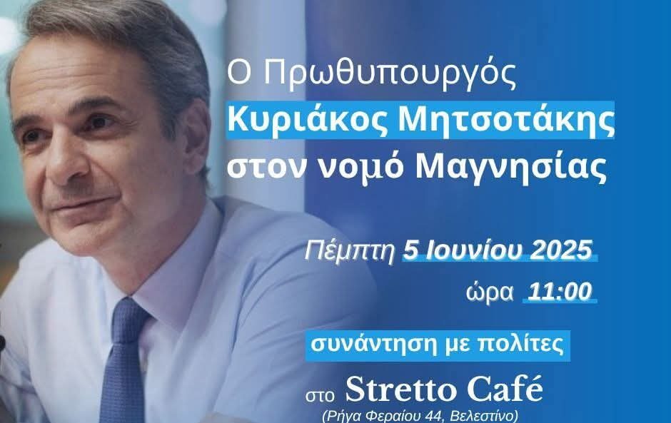Στη Μαγνησία θα βρεθεί αύριο, Πέμπτη 5 Ιουνίου ο Πρωθυπουργός Κυριάκος Μητσοτάκης και θα επισκεφθεί μεταξύ άλλων και το Βελεστίνο. Ειδικότερα, όπως κάνει γνωστό η ΔΕΕΠ ΝΔ Μαγνησίας, ο Κ. Μητσοτάκης θα είναι στο Βελεστίνο στις 11:00 το πρωί και θα συναντηθεί με πολίτες στον πεζόδρομο και συγκεκριμένα στην καφετέρια Stretto.