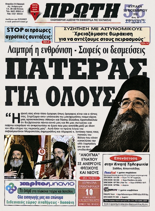 «Πέρασαν 18 ολόκληρα χρόνια από την 14η Νοεμβρίου 1998, όταν η πόλη του Βόλου και η Τοπική μας Εκκλησία, υποδέχθηκαν επισήμως το νέο Ποιμενάρχη της Δημητριάδος, τον Σεβ. Μητροπολίτη κ. Ιγνάτιο, εις διαδοχήν του μεγάλου προκατόχου του κυρού Χριστοδούλου, ο οποίος επτά μήνες πριν είχε αναδειχθεί Αρχιεπίσκοπος Αθηνών & Πάσης Ελλάδος», αναφέρει η Μητρόπολη Δημητριάδος.
