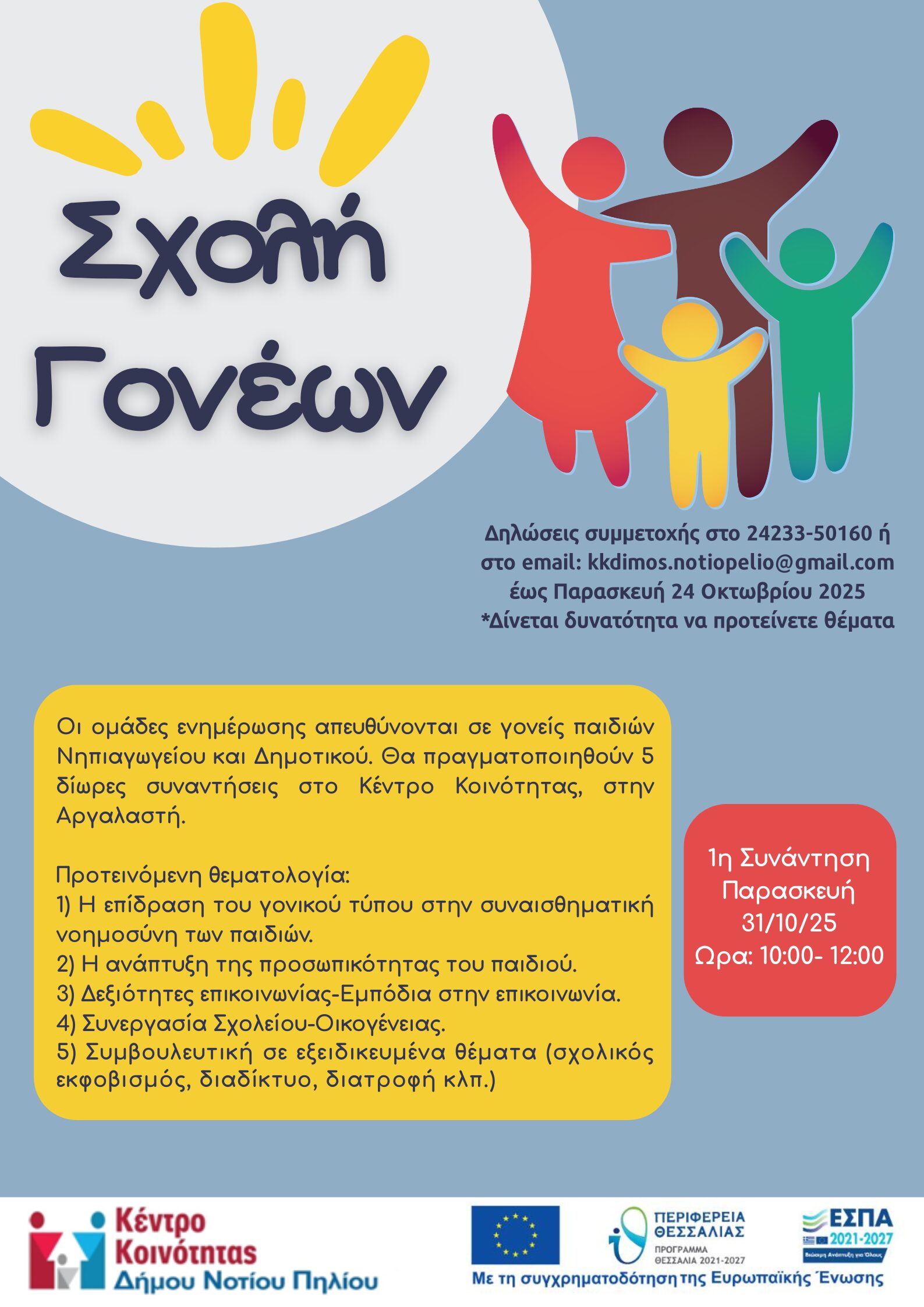 Το Κέντρο Κοινότητας Δήμου Νοτίου Πηλίου έχοντας ως βασικό στόχο την ψυχοκοινωνική υποστήριξη των οικογενειών, δημιουργεί Ομάδες Ενημέρωσης Γονέων.