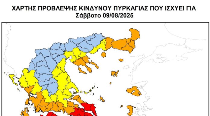 Ταυτόχρονα με βάση τον Ημερήσιο Χάρτη Πρόβλεψης Κινδύνου Πυρκαγιάς της Γενικής Γραμματείας Πολιτικής Προστασίας, για το Σάββατο 9 Αυγούστου, προβλέπεται Κατηγορία Κινδύνου 3 (υψηλή) για την Π.Ε. Λάρισας και για τις Π.Ε. Μαγνησίας & Σποράδων.
