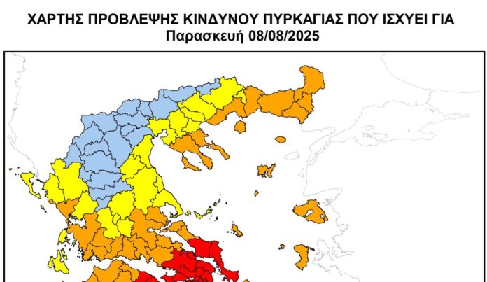 Όπως προβλέπεται με τον Ημερήσιο Χάρτη Πρόβλεψης Κινδύνου Πυρκαγιάς της Γενικής Γραμματείας Πολιτικής Προστασίας, για την Παρασκευή 8 Αυγούστου, προβλέπεται Κατηγορία Κινδύνου 3 (υψηλή) για την Π.Ε. Λάρισας, περιοχές της Π.Ε. Καρδίτσας (αρμοδιότητα δασαρχείου Καρδίτσας), περιοχές της Π.Ε. Μαγνησίας (αρμοδιότητα δασαρχείου Βόλου) και στις Σποράδες, ενώ προβλέπεται Κατηγορία Κινδύνου 4 (πολύ υψηλή) για περιοχές της Π.Ε. Μαγνησίας (αρμοδιότητα δασαρχείου Αλμυρού).