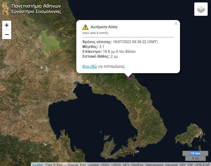 Σεισμική δόνηση έντασης 3,1 βαθμών της κλίμακας ρίχτερ σημειώθηκε στις 3.36 τα ξημερώματα του Σαββάτου 16 Ιουλίου, ξυπνώντας τους Βολιώτες μέσα στη νύχτα. Σύμφωνα με το Εργαστήριο Σεισμολογίας του Πανεπιστημίου Αθηνών, το επίκεντρο του σεισμού εντοπίζεται 19,8 χλμ ανατολικά του Βόλου και σε εστιακό βάθος 2 χλμ.