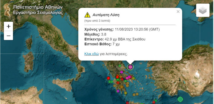 Σεισμός μεγέθους 3,8 βαθμών της Κλίμακας Ρίχτερ σημειώθηκε στις 4.20 σήμερα το μεσημέρι 42.9 χμ βόρεια- βορειοανατολικά της Σκιάθου και με εστιακό βάθος 7 χλμ.. Η σεισμικό δόνηση έγινε αισθητή και στον Βόλο, ενώ είναι μέχρι στιγμής η ισχυρότερη από πολλές δονήσεις που έχουν σημειωθεί στην ίδια περιοχή τα τελευταία 24ωρα.