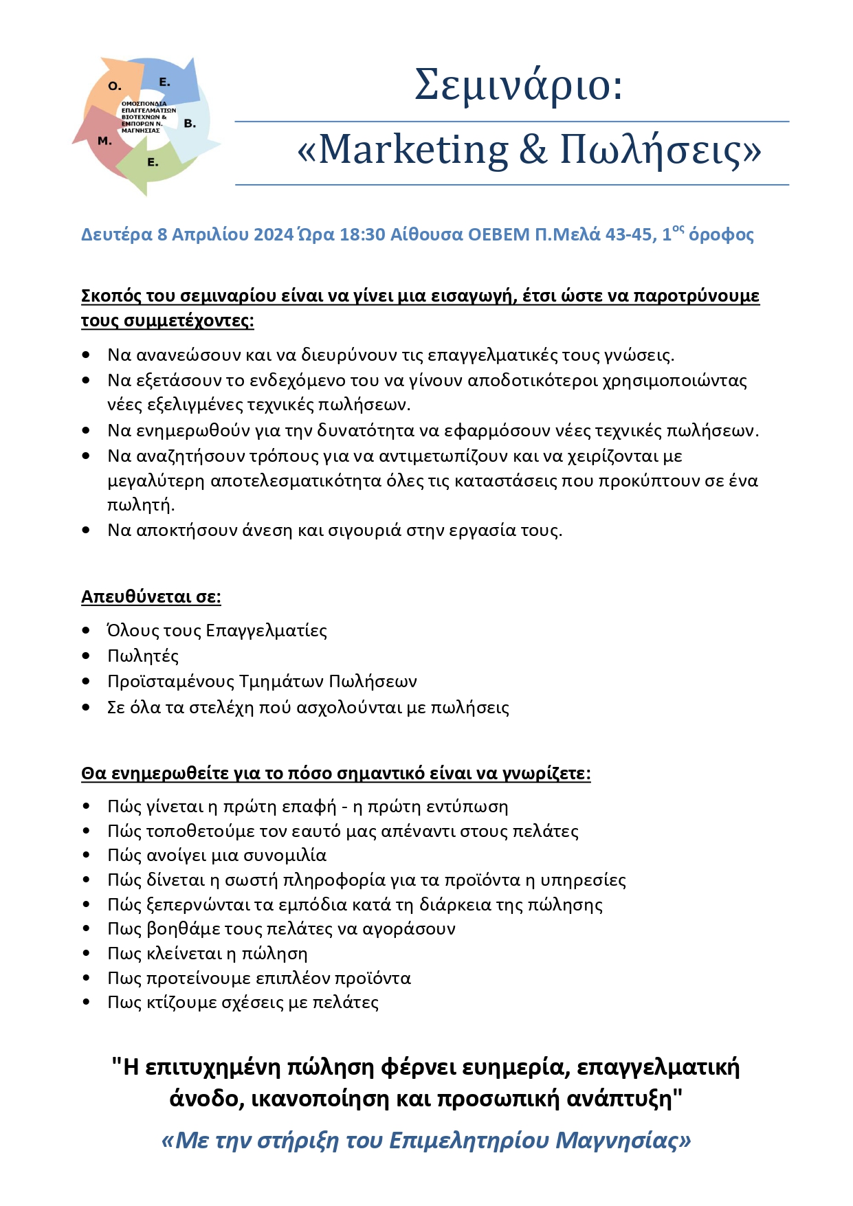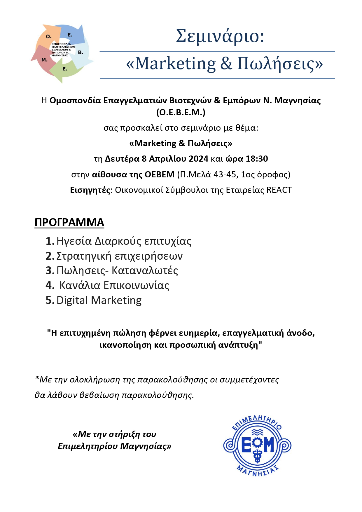Σεμινάριο με θέμα «Marketing και Πωλήσεις» διοργανώσει σήμερα, Δευτέρα 8 Απριλίου στις 18:30 η ΟΕΒΕΜ στα γραφεία της στην οδό Π. Μελά 43-45, στον 1ο όροφο με εισηγητές οικονομικούς συμβούλους της Εταιρείας REACT. Μετά την ολοκλήρωση παρακολούθησης οι συμμετέχοντες θα λάβουν βεβαίωση παρακολούθησης. Το σεμινάριο πραγματοποιείται με τη στήριξη του Επιμελητηρίου Μαγνησίας.