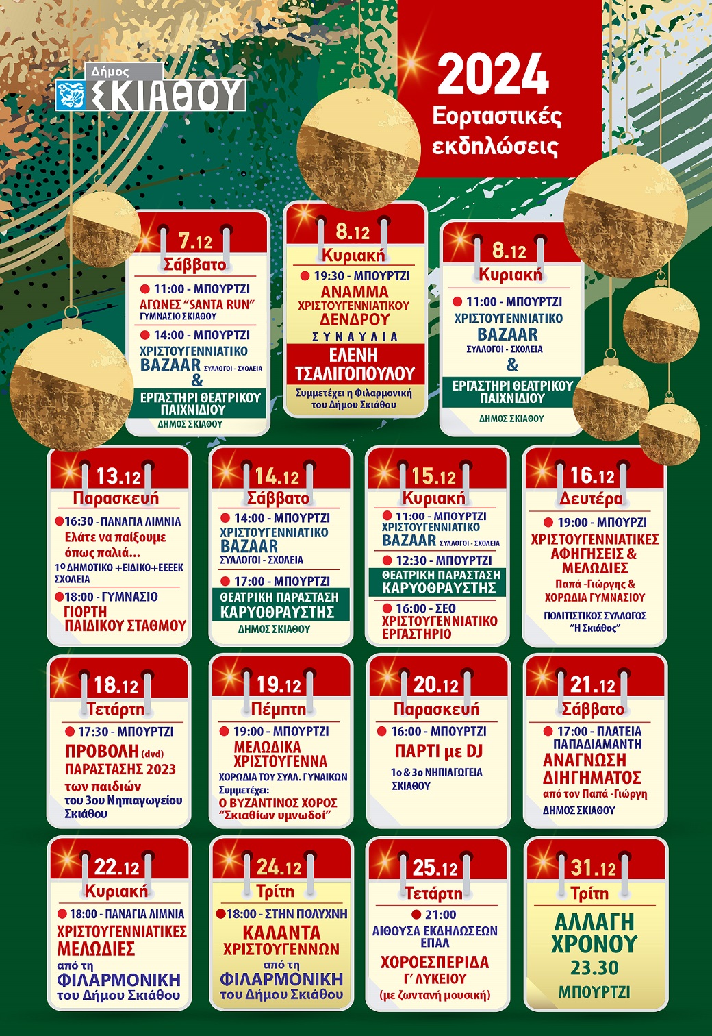 Για το διάστημα από 7 έως 31 Δεκεμβρίου, 23 συνολικά εορταστικές εκδηλώσεις έχουν προγραμματιστεί με τη συμμετοχή της Εκπαιδευτικής Κοινότητας, του Πνευματικού Κέντρου των Ιερών Ναών, της Φιλαρμονικής του Δήμου Σκιάθου, των Συλλόγων Γονέων, Πολιτιστικών Συλλόγων, των Εθελοντών και του Δήμου, σε διάφορα σημεία του νησιού που φιλοδοξούν να μετατρέψουν το νησί σε μία μεγάλη γιορτινή σκηνή για μικρούς και μεγάλους.