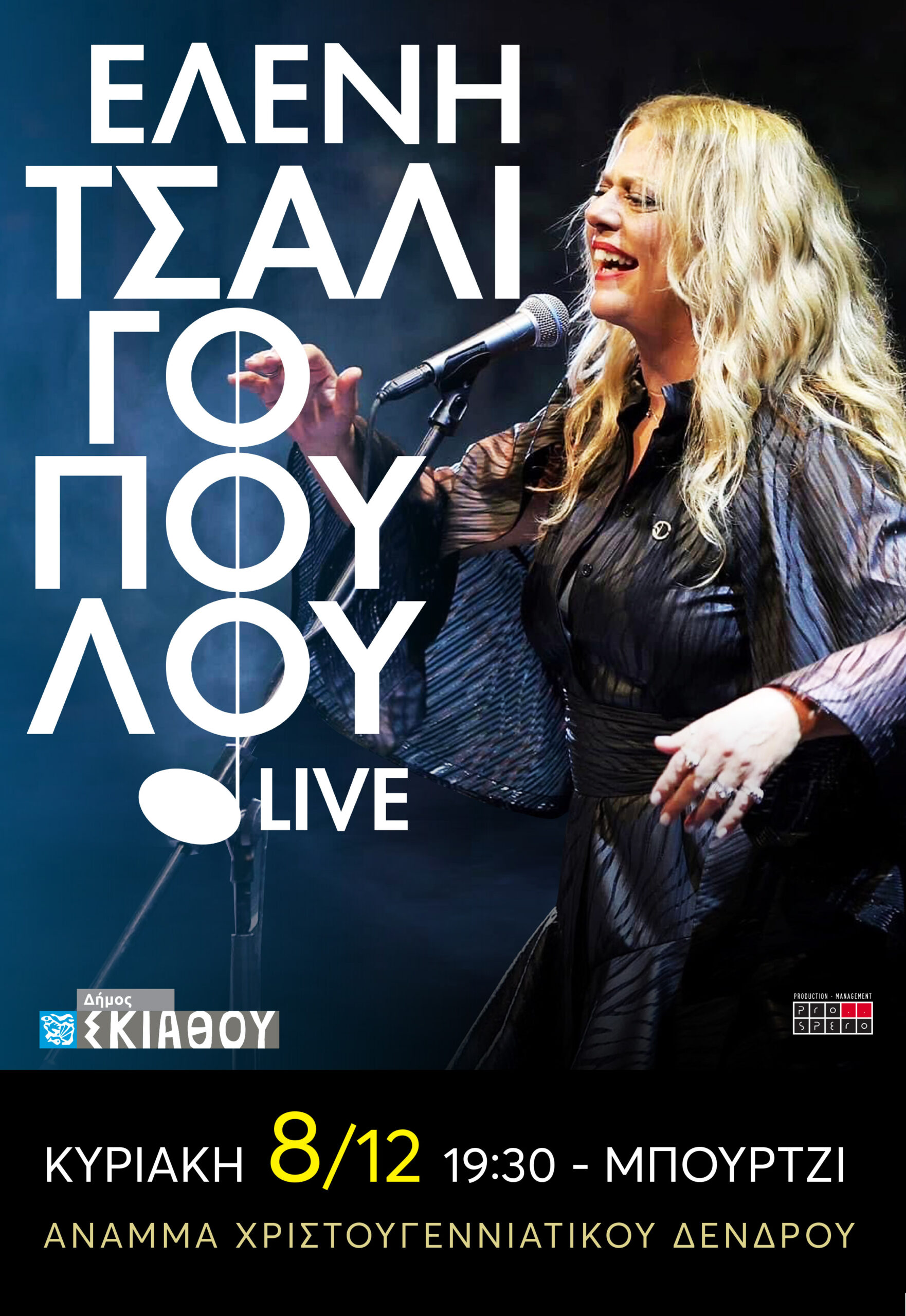 Ο Δήμος Σκιάθου, διοργανώνει μια μεγάλη συναυλία με την Ελένη Τσαλιγοπούλου την Κυριακή 8 Δεκεμβρίου, που θα σηματοδοτήσει την έναρξη των χριστουγεννιάτικων εκδηλώσεων με το άναμμα του χριστουγεννιάτικου δέντρου, το οποίο “ταξίδεψε” από τεχνητή φυτεία της Χαλκιδικής.