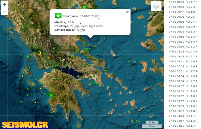 Η δόνηση ήταν μεγέθους 3,1 της Κλίμακας Ρίχτερ, σημειώθηκε σήμερα 07-01-2025 και ώρα 08:13, με επίκεντρο 20 χλμ. Βόρεια της Σκιάθου και σε εστιακό βάθος 10 χλμ.