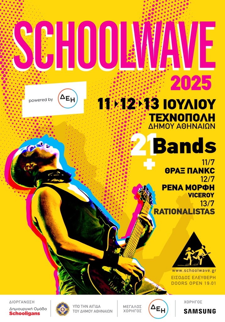 Το Schoolwave 2025 powered by ΔΕΗ θα πραγματοποιηθεί στις 11-12-13 Ιουλίου στην Τεχνόπολη του Δήμου Αθηναίων με ελεύθερη είσοδο. Θα εμφανιστούν 21 μαθητικά και φοιτητικά συγκροτήματα από όλη την Ελλάδα εκπροσωπώντας διαφορετικά είδη μουσικής: alt rock από την Αθήνα, post punk από τα Γιάννενα, thrash metal από τη Λάρισα, αλλά και παραδοσιακά από την Κρήτη.