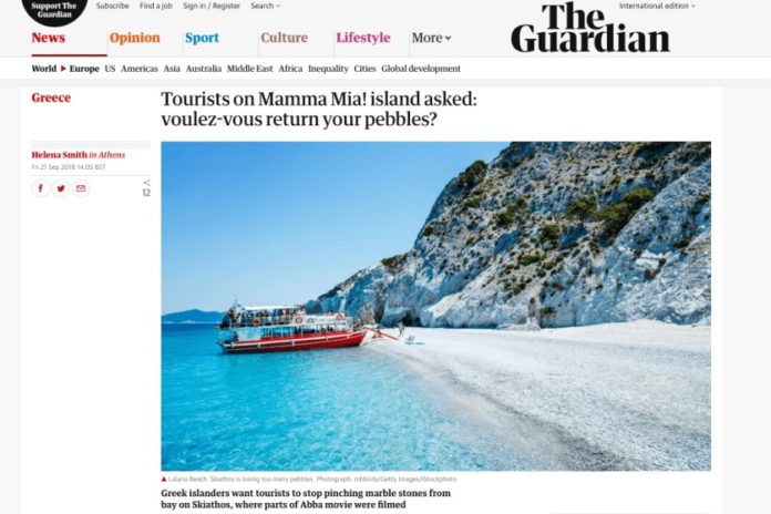 Δημοσίευμα της βρετανικής εφημερίδας Guardian καταγράφει τα μέτρα που αναγκάζονται να πάρουν οι κάτοικοι της Σκιάθου για να αποτρέψουν την περαιτέρω αλλοίωση της παραλίας Λαλάρια, ζητώντας μεταξύ άλλων από τους τουρίστες να επιστρέψουν τα βότσαλα τους. Στο άρθρο υπό τον τίτλο, «Το νησί του Mamma Mia ρωτά τους τουρίστες: Θέλετε να επιστρέψετε τα βότσαλά σας;», αναφέρει ότι η Σκιάθος χάνει τα ολοστρόγγυλα βότσαλά της πολύ γρήγορα, γεγονός που οδήγησε τους ντόπιους να διεξάγουν εκστρατεία για να σώσουν την παραλία από τους τουρίστες, που παίρνουν τις μαρμάρινες πέτρες του νησιού. Ειδικότερα, τοποθέτησαν κουτιά στο αεροδρόμιο του νησιού με τα οποία ζητούν από τους τουρίστες να επιστρέψουν τα περίφημα βότσαλα. «Αυτήν την εβδομάδα, εμφανίστηκαν στο αεροδρόμιο της Σκιάθου κουτιά με τον τίτλο «Κουτί με βότσαλα της παραλίας Λαλάρια», αναφέρει χαρακτηριστικά η βρετανική εφημερίδα. «Δεν είχαμε άλλη επιλογή», δήλωσε ο Θοδωρής Τζούμας, επικεφαλής του Πολιτιστικού Συλλόγου της Σκιάθου, στο Guardian. «Η παραλία Λαλάρια μπορεί να μην έχει υποστεί κατολίσθηση, όμως η ανθρώπινη παρέμβαση είναι τέτοια που η φυσική της ομορφιά καταστρέφεται με ανησυχητικό ρυθμό», υπογραμμίζει το σχετικό δημοσίευμα.