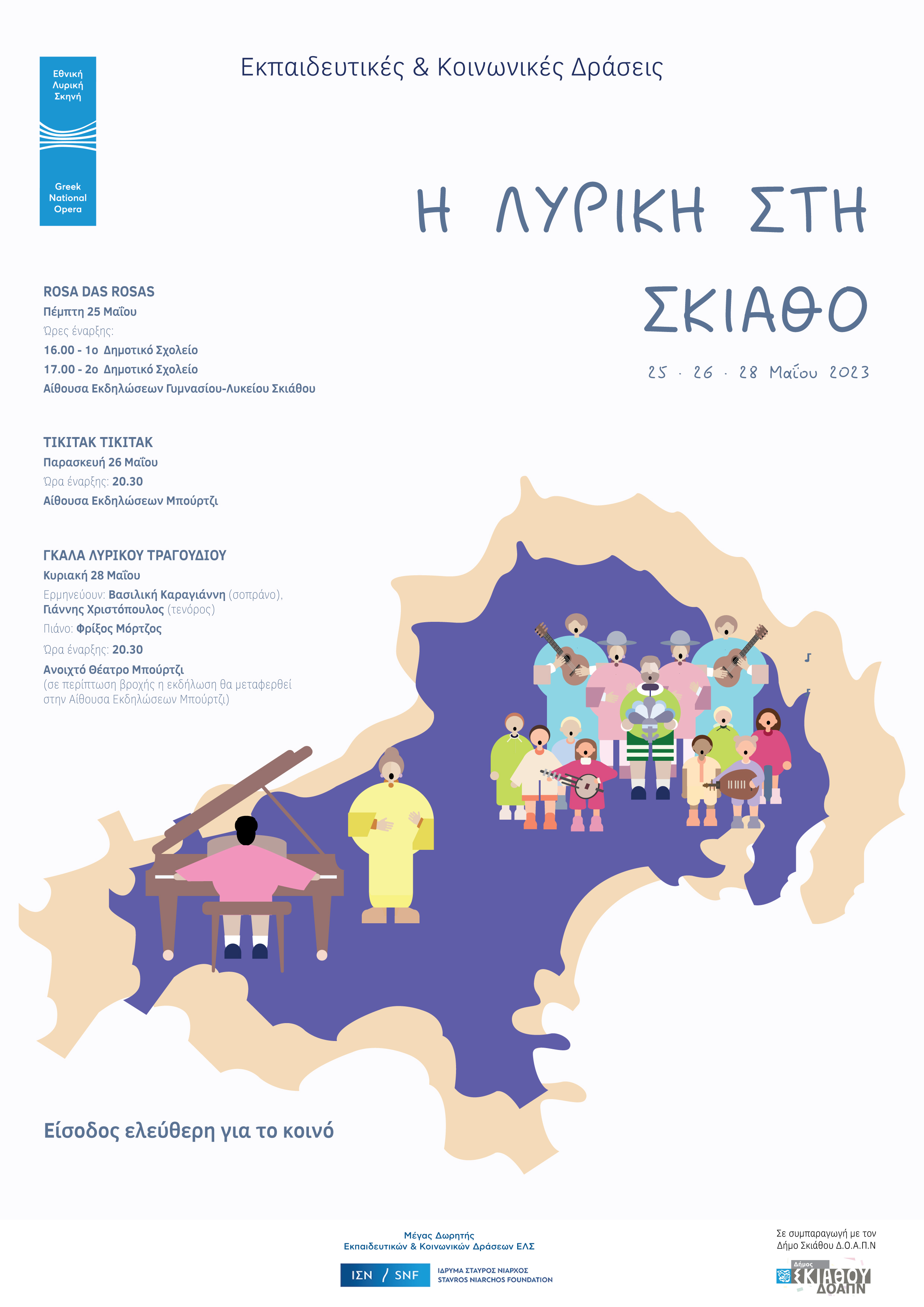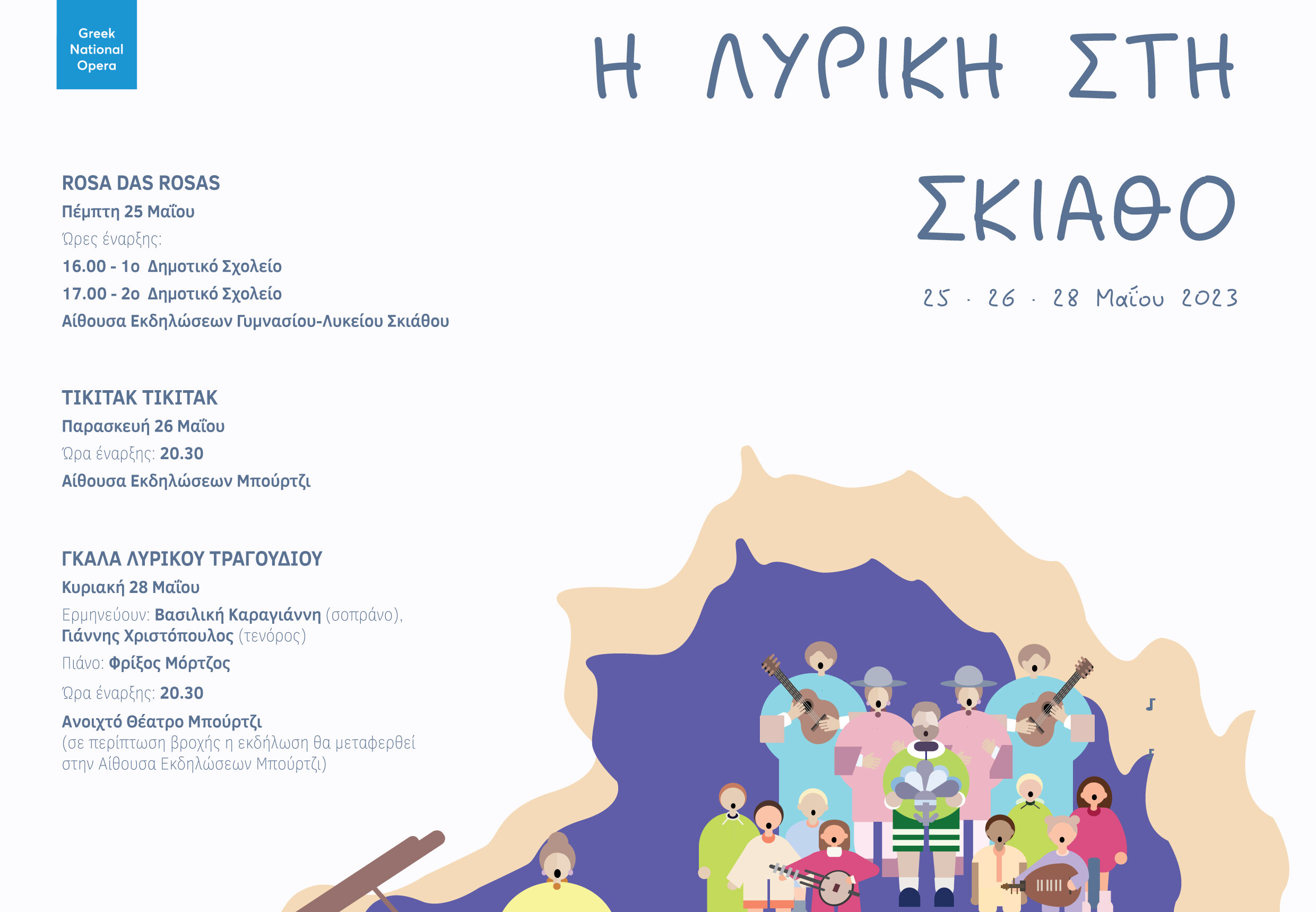 Οι Εκπαιδευτικές & Κοινωνικές Δράσεις της Εθνικής Λυρικής Σκηνής σε συμπαραγωγή με τον Δήμο Σκιάθου, διοργανώνουν μια σειρά ξεχωριστών εκδηλώσεων μουσικού θεάτρου και λυρικού τραγουδιού, στις 25, 26 και 28 Μαΐου 2023, με είσοδο ελεύθερη για το κοινό. Οι δημότες όλων των ηλικιών θα έχουν την ευκαιρία να απολαύσουν ένα τριήμερο μουσικό οδοιπορικό από την εποχή του ευρωπαϊκού Μεσαίωνα και την προφορική παράδοση της Μεσογείου σε γνωστά και αγαπημένα τραγούδια της ελληνικής οπερέτας και του ελαφρού τραγουδιού και από εκεί σε διάσημες άριες και ντουέτα από δημοφιλείς όπερες.