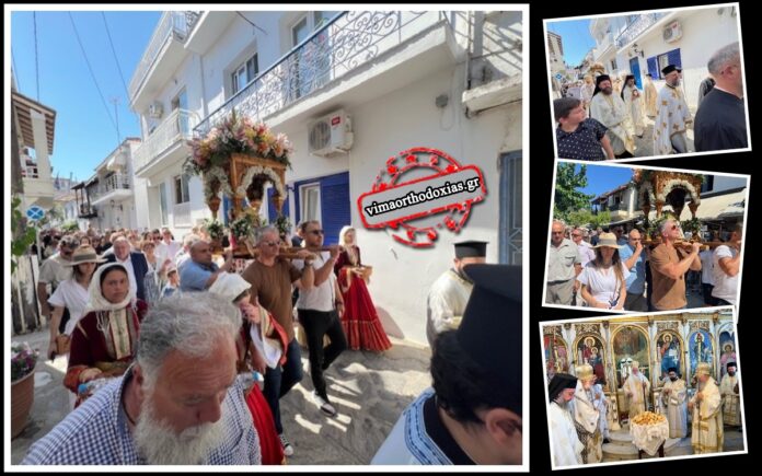 Η ημέρα κορυφώθηκε με τη μεγαλειώδη λιτανεία της Αγίας Εικόνας στους δρόμους της Χώρας. Η λιτανεία ξεκίνησε από τον Ιερό Ναό και κινήθηκε μέσα από τα γραφικά σοκάκια του νησιού, προεξάρχοντος του Σεβασμιωτάτου Μητροπολίτη Θηβών και Λεβαδείας κ. Γεωργίου, με τη συμμετοχή των Σεβασμιωτάτων Μητροπολιτών Χαλκίδος κ. Χρυσοστόμου και Σκοπέλου κ. Νικοδήμου.