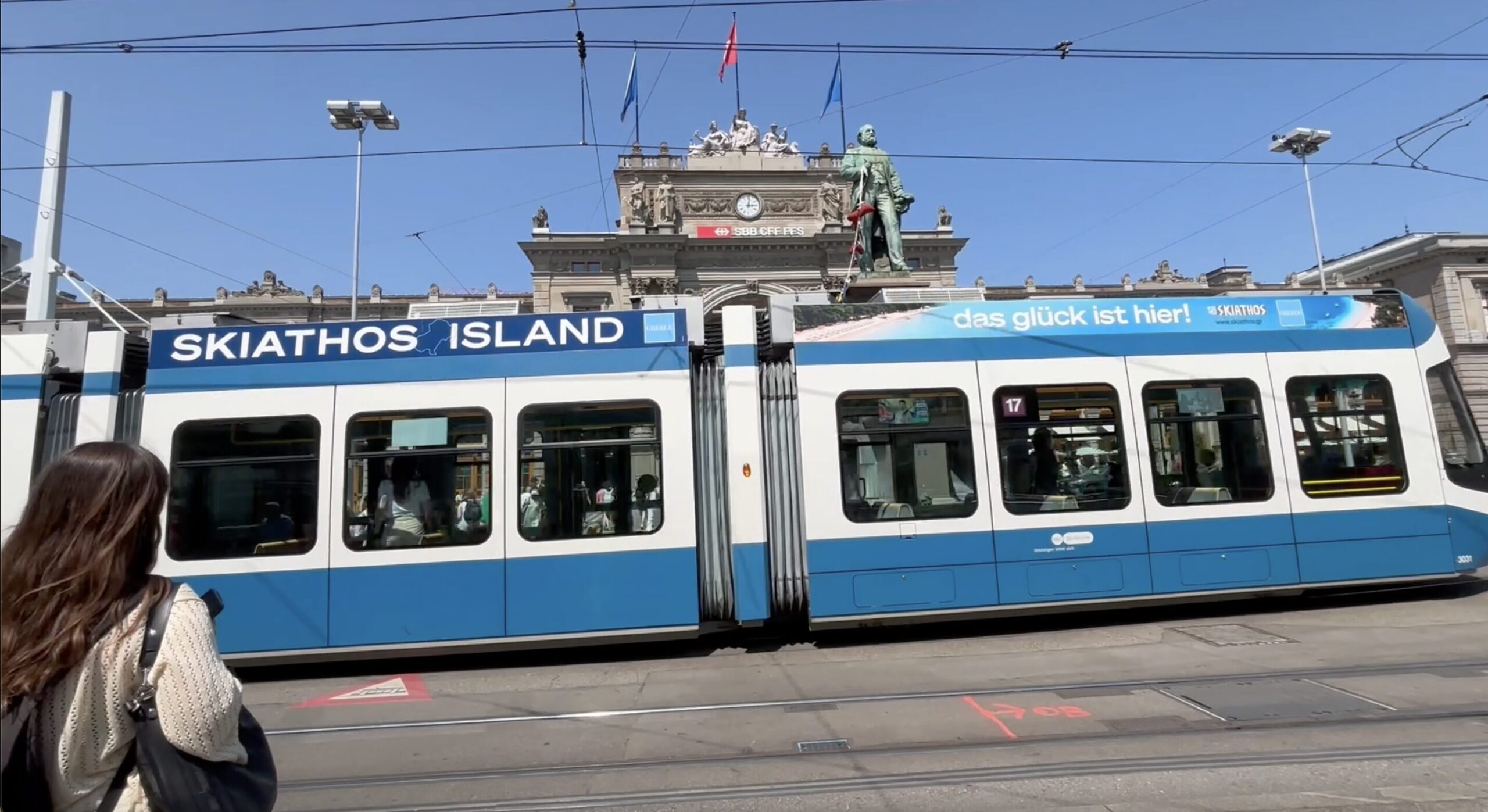 Το δημιουργικό της καμπάνιας, τοποθετημένο εξωτερικά στο τραμ, προβάλλει χαρακτηριστική εικόνα της Σκιάθου, μεταφέροντας ένα μήνυμα χαράς, φυσικής ομορφιάς και φιλοξενίας στο αστικό τοπίο της Ζυρίχης.