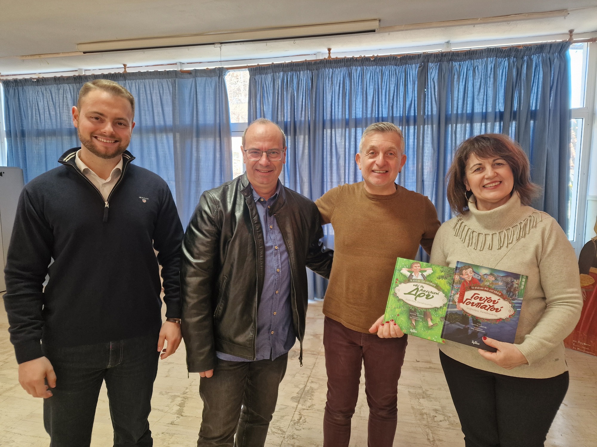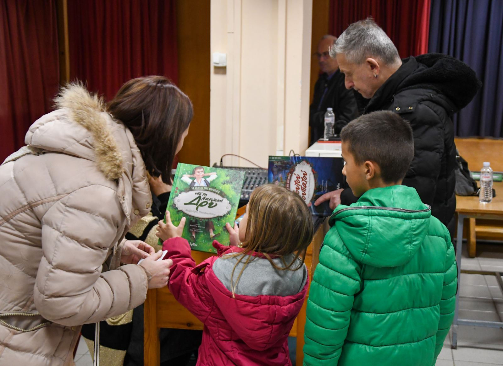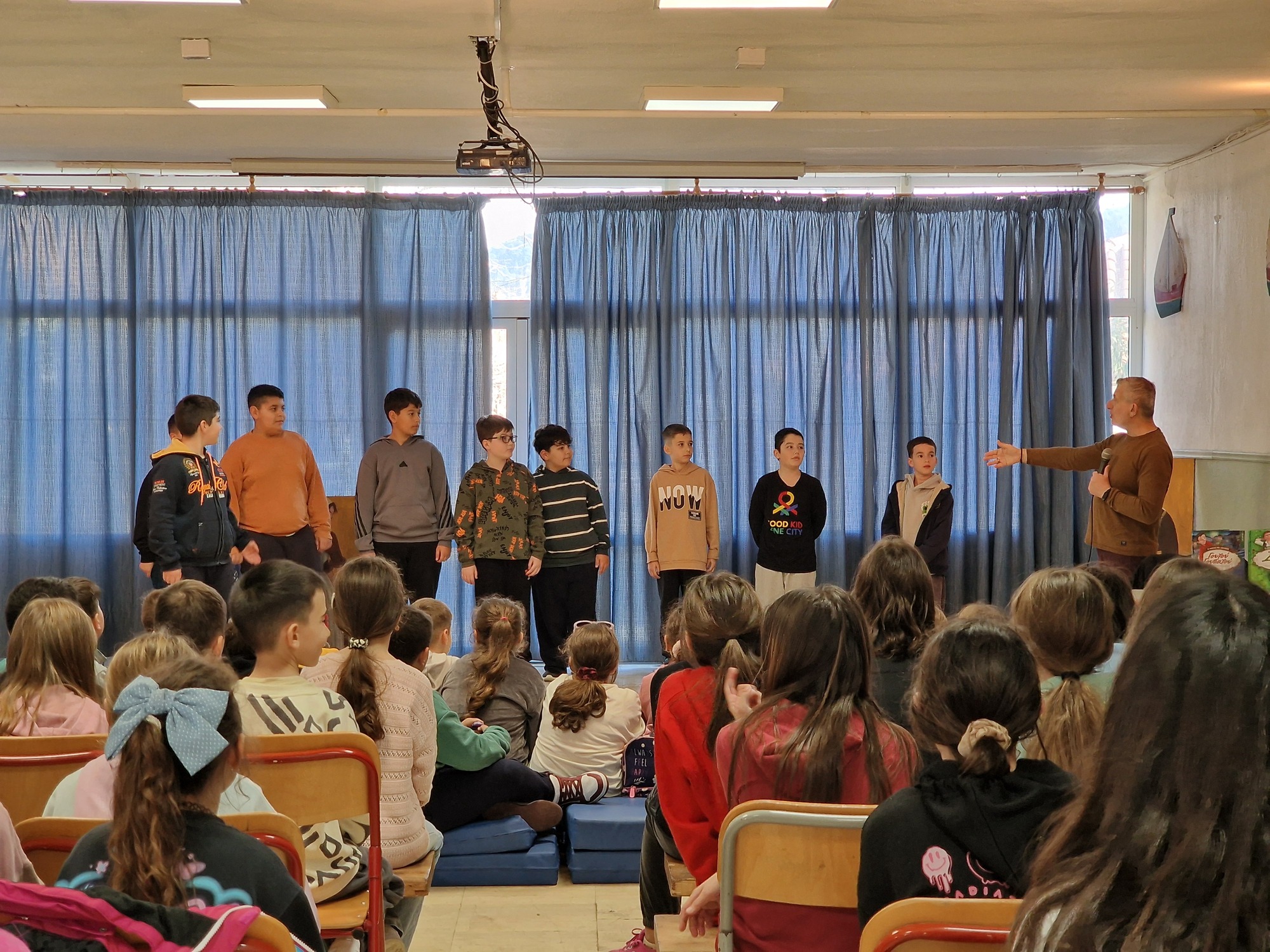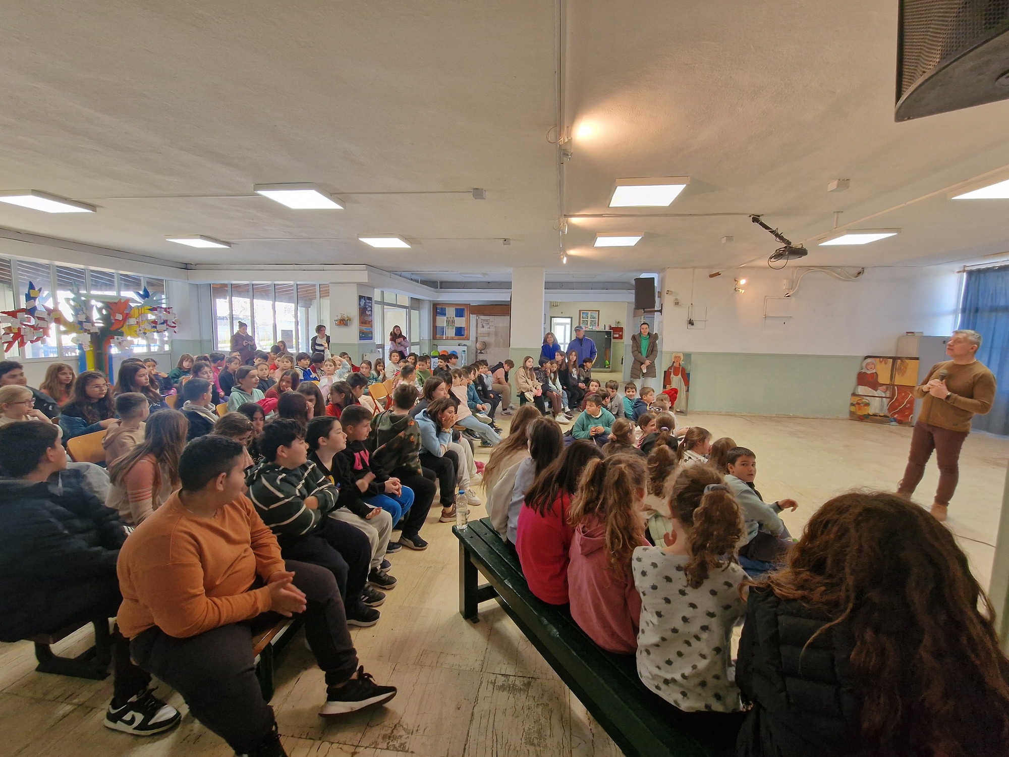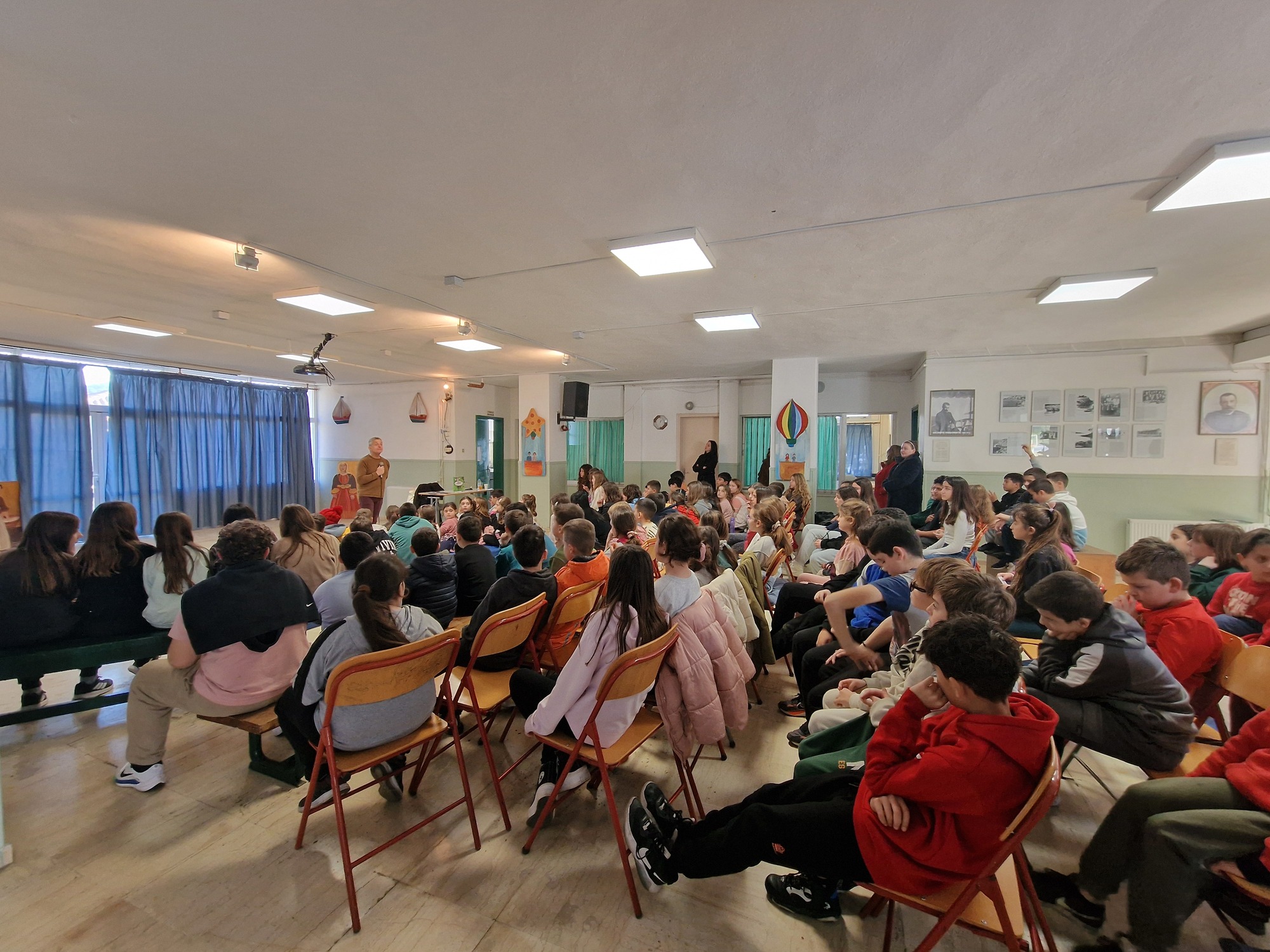 Ο συγγραφέας αρχικά φιλοξενήθηκε το πρωί της Παρασκευής στο 1ο Δημοτικό Σχολείο όπου η έκπληξη των μαθητών από την Ε1 τάξη της κ. Μαρινέλας Σαμαρά που δραματοποίησαν μια σκηνή από το διήγημα “Γούτου Γουπατού ” και ήταν μια ευχάριστη και συγκινητική στιγμή για τον ίδιο.