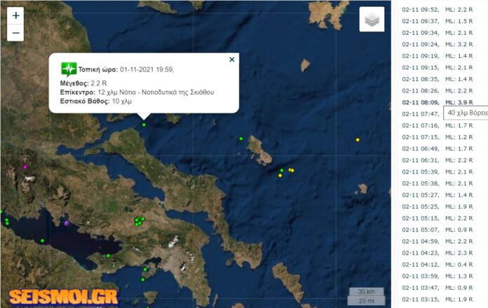 Μικροσεισμός σημειώθηκε στις 19.59 χθες το απόγευμα νοτιοδυτικά της Σκιάθου.