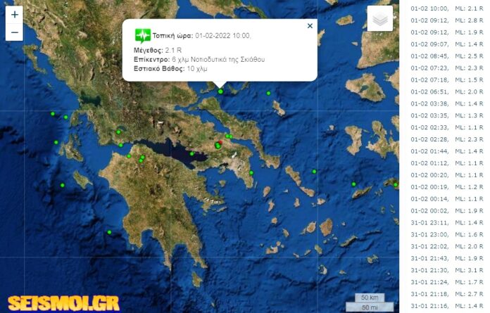 Ασθενής σεισμική δόνηση σημειώθηκε στις 10 σήμερα το πρωί με επίκεντρο 6 χλμ. νοτιοδυτικά της Σκιάθου.