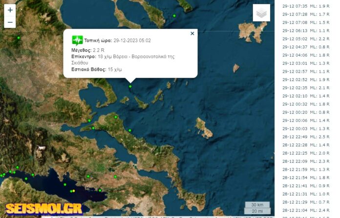 Σεισμική δόνηση μεγέθους 2,2 της κλίμακας Ρίχτερ σημειώθηκε σήμερα στις 5.02 το πρωί, με επίκεντρο τη θάλασσα 18 χλμ. βόρεια-βορειοανατολικά της Σκιάθου.