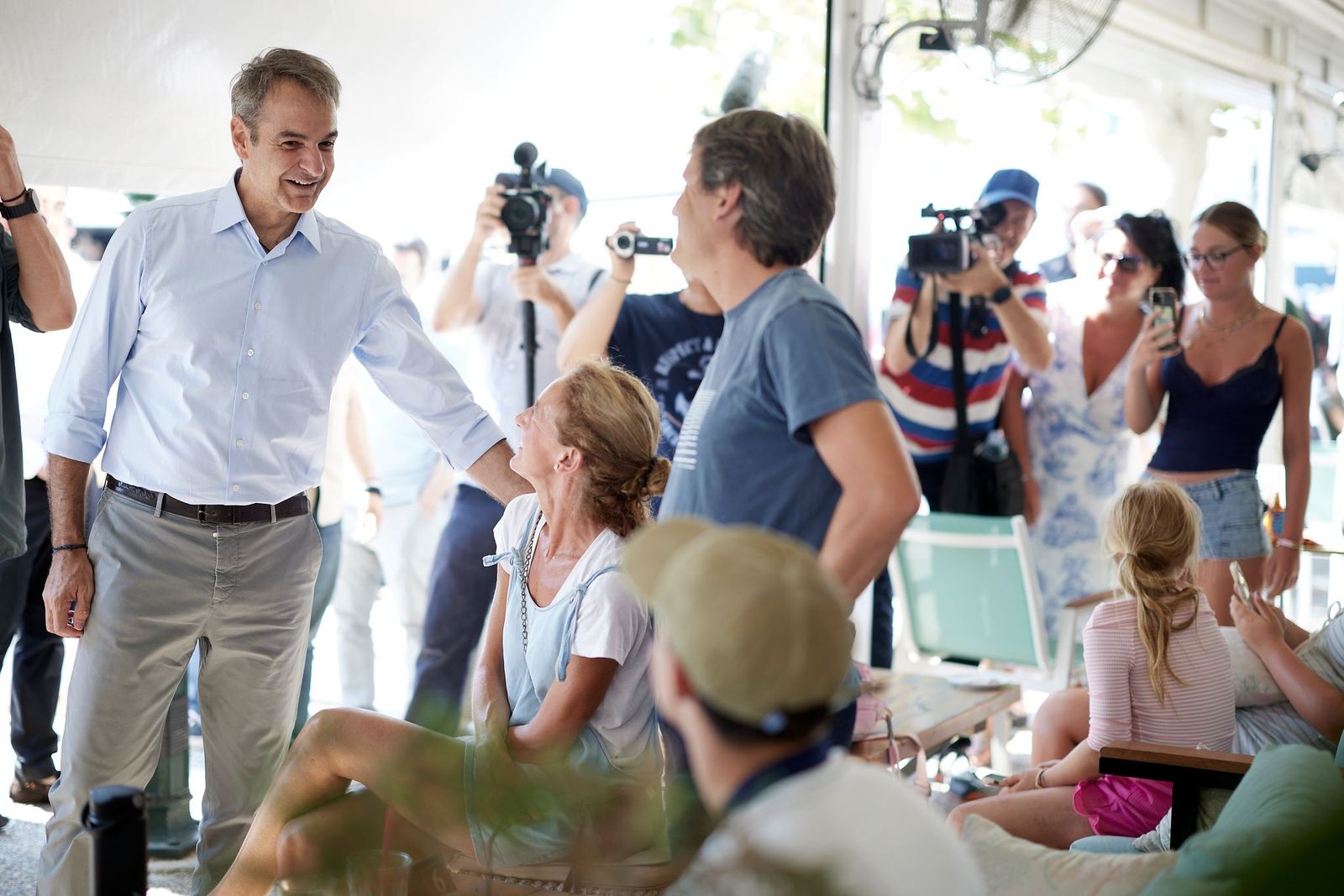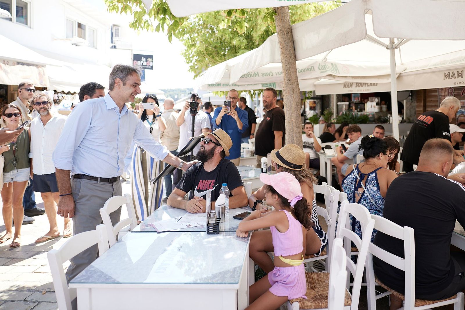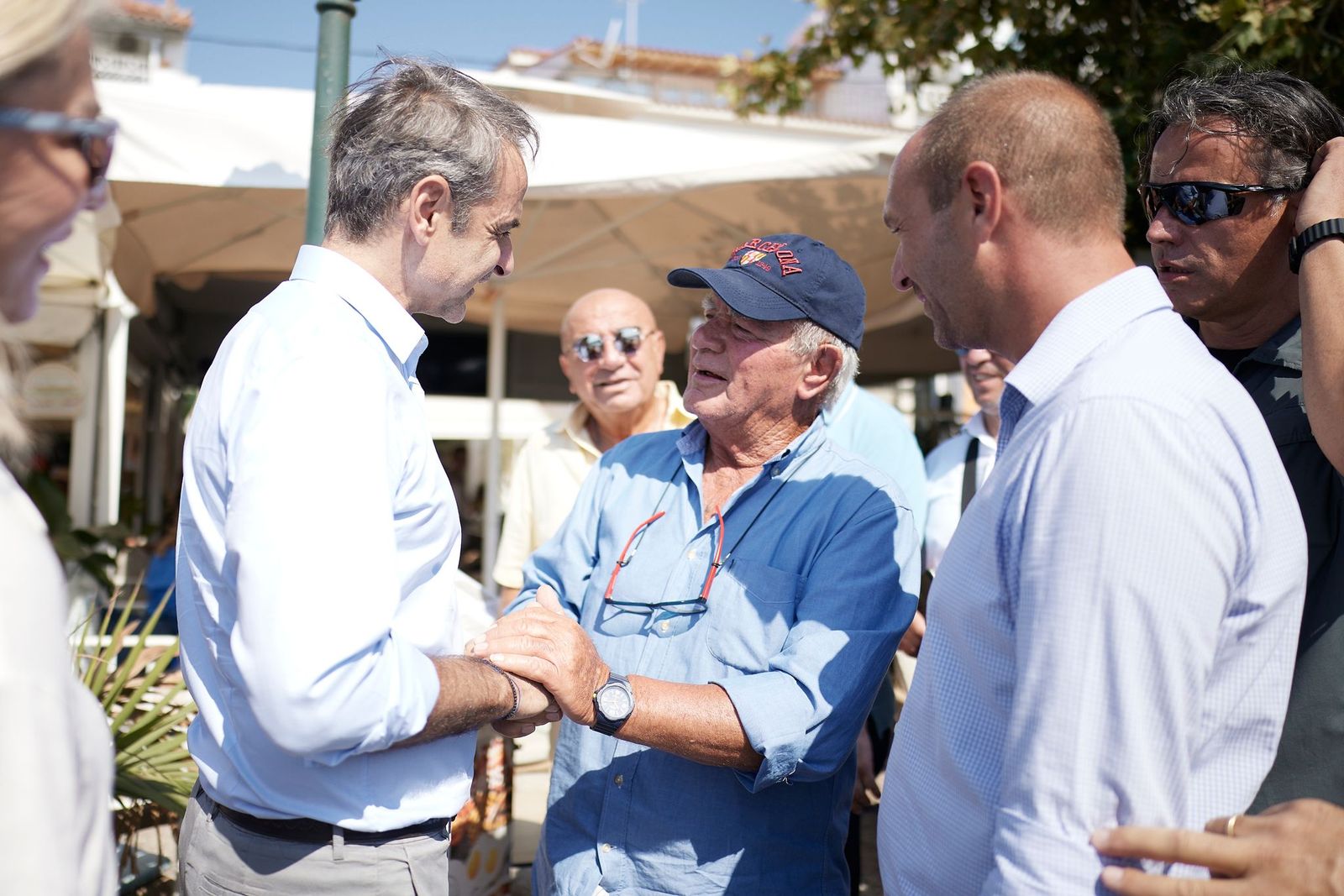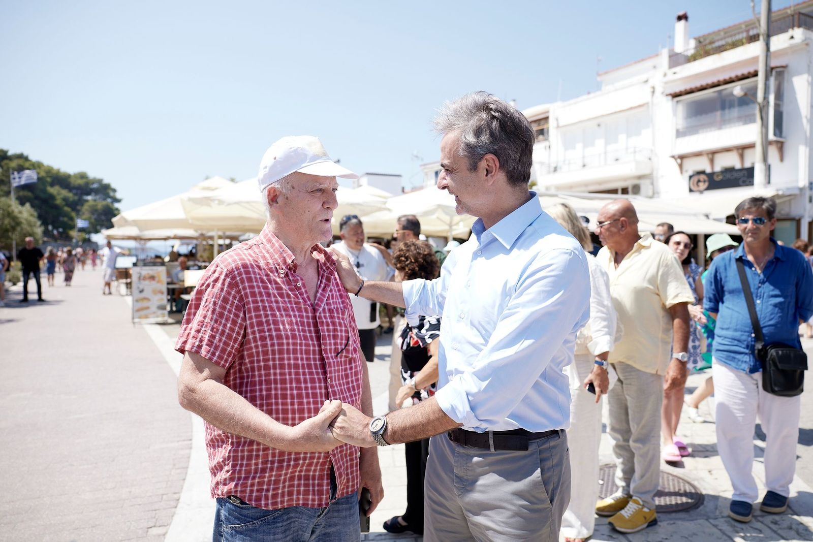 Στο πλαίσιο της επίσκεψής του στη Σκιάθο, ο Πρωθυπουργός έχει την ευκαιρία να συνομιλήσει με καταστηματάρχες, κατοίκους και επισκέπτες που βρίσκονταν στο λιμάνι.